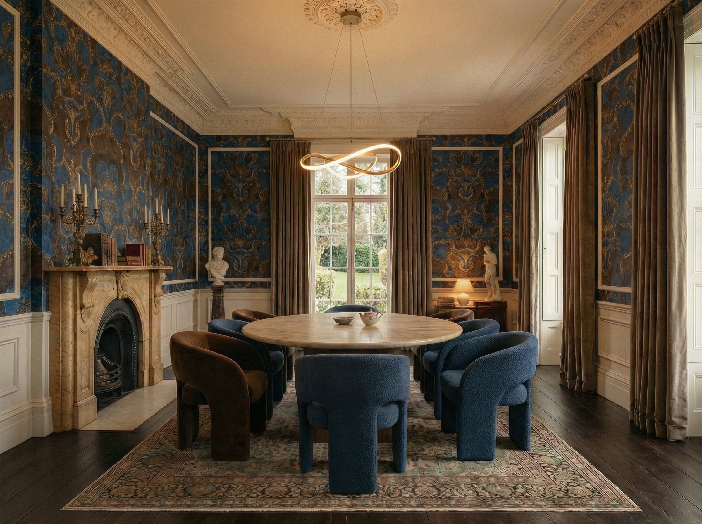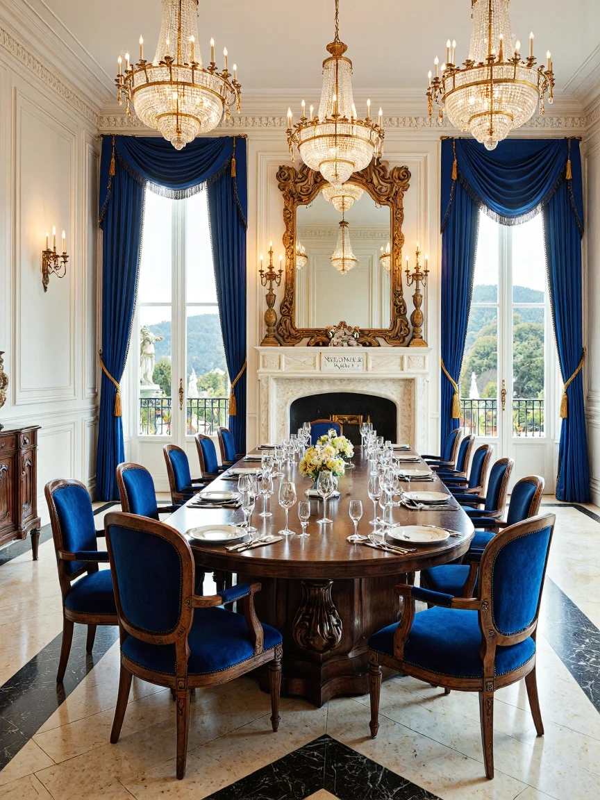 A Neoclassical dining room featuring a large mahogany table for eight, royal blue velvet chairs with carved wooden frames, marble flooring in beige and black, off-white walls with plaster moldings, a grand cream marble fireplace, and floor-to-ceiling windows with luxurious silk velvet curtains.