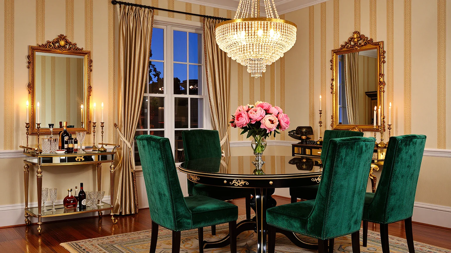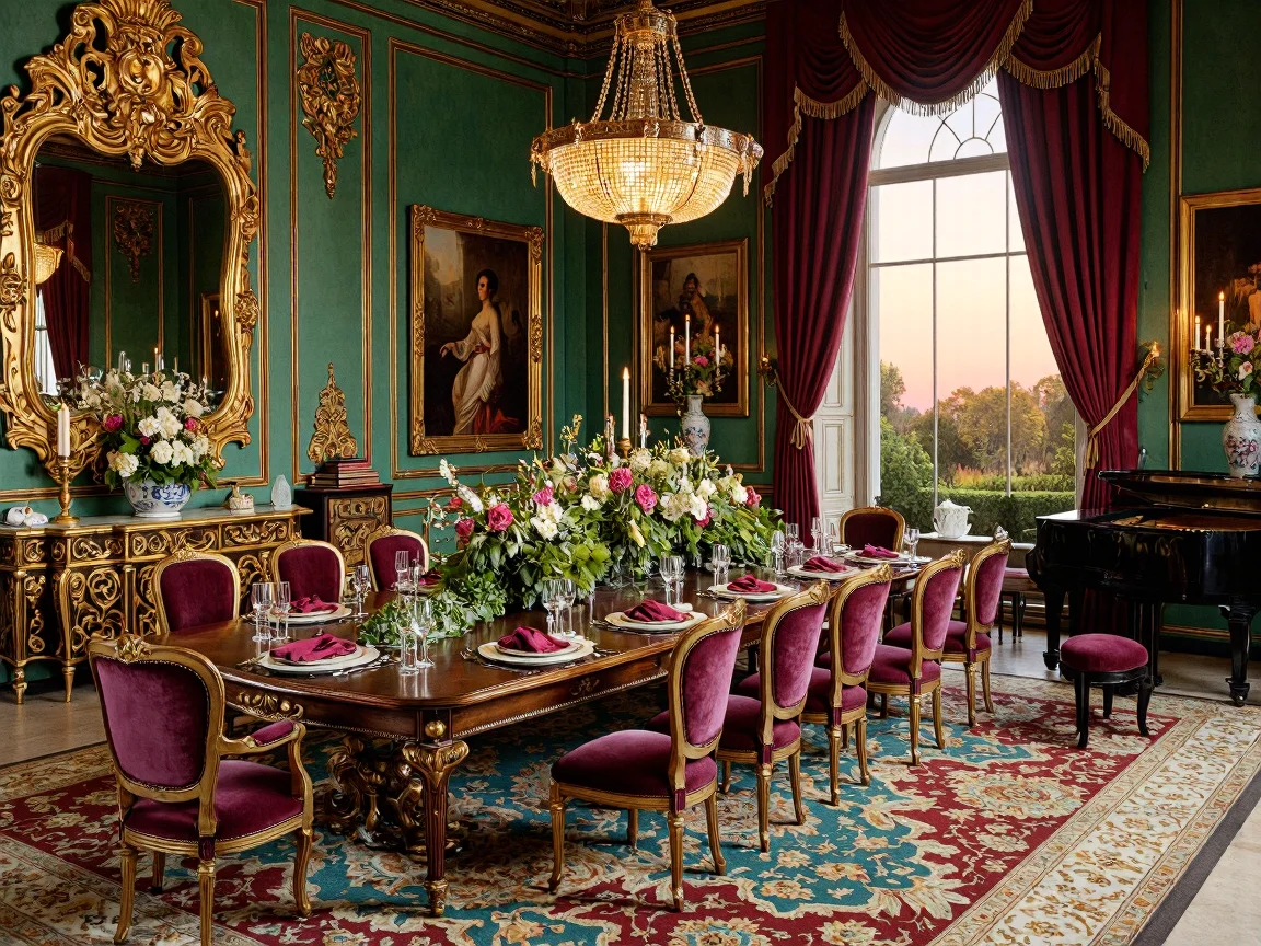 A lavish maximalist dining room featuring a polished dark mahogany oval table with an extravagant centerpiece of a golden candelabra and crystal glassware, surrounded by high-back velvet chairs. The walls are adorned with bold floral wallpaper and an oversized gold-framed mirror, complemented by an elaborate chandelier and a Persian rug with vibrant geometric patterns. Tall French windows are draped in heavy navy curtains, flanked by fiddle leaf fig trees, and the space is accentuated with framed Renaissance oil paintings.