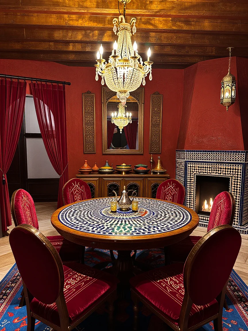 Upload a dining room photo to redesign it as "Elegant formal dining with brass accents."