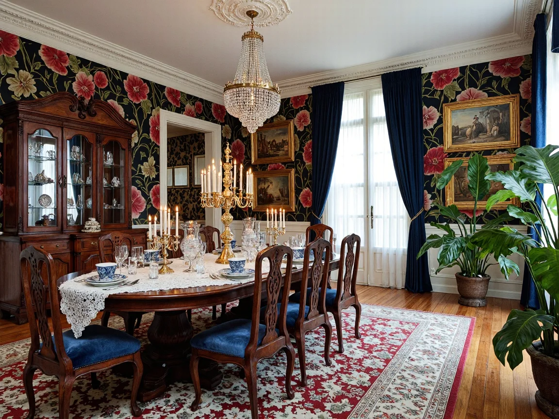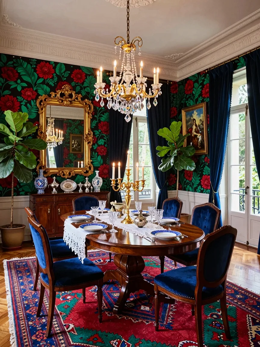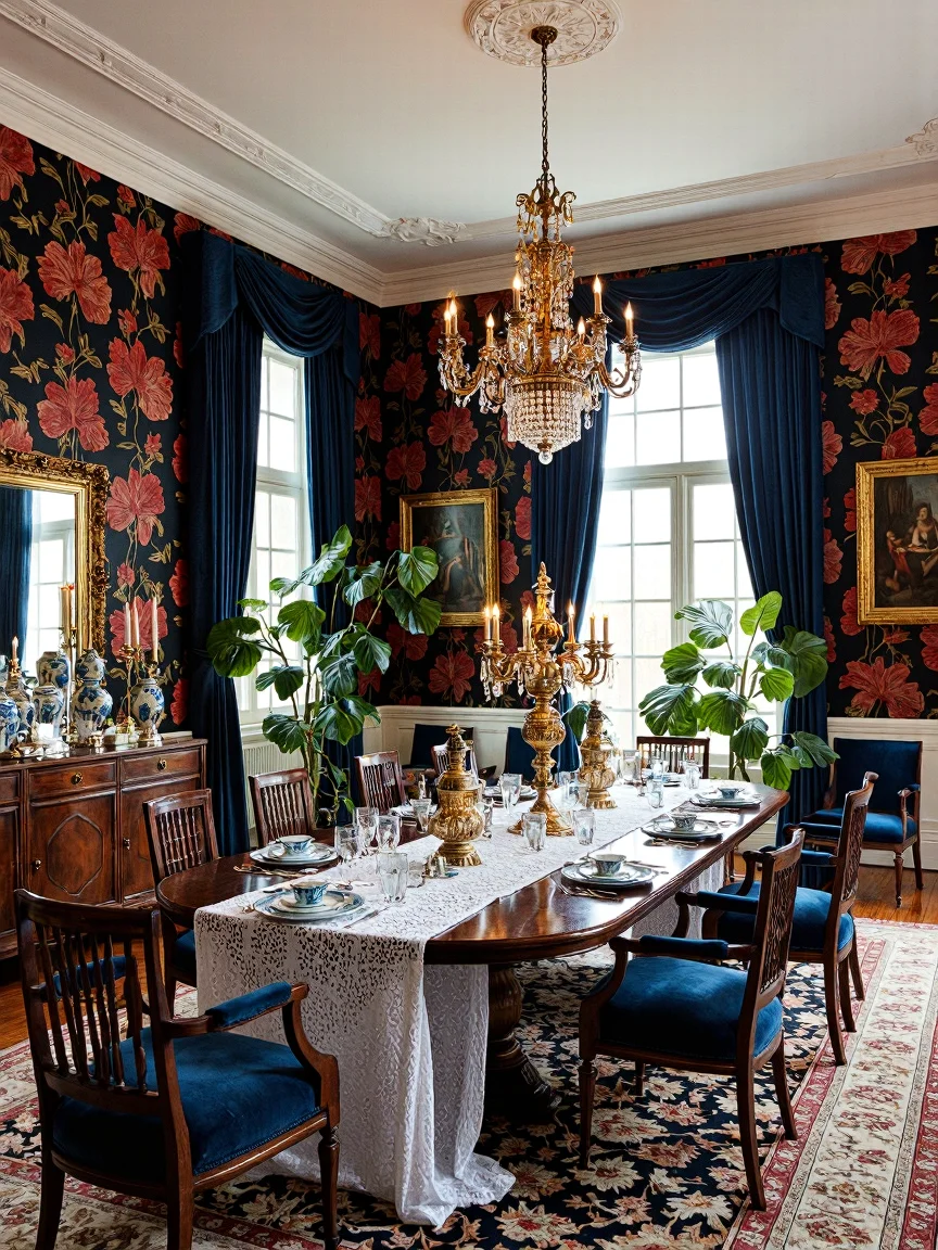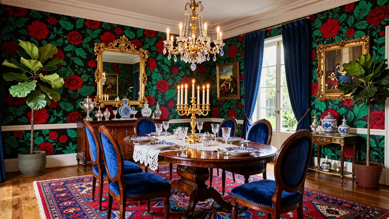 A maximalist dining room featuring a polished dark mahogany oval table with a white lace tablecloth, an extravagant golden candelabra centerpiece, royal blue velvet high-back chairs, a mahogany sideboard with silverware, an oversized gold-framed mirror, floral wallpaper in jewel tones, an ornate chandelier, a vibrant Persian rug, tall French windows with navy-blue curtains, and fiddle leaf fig trees.
