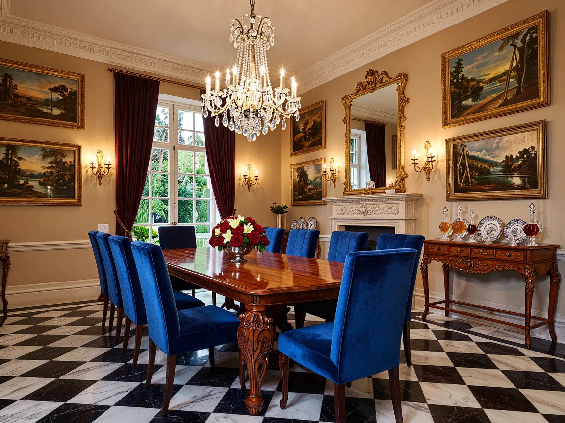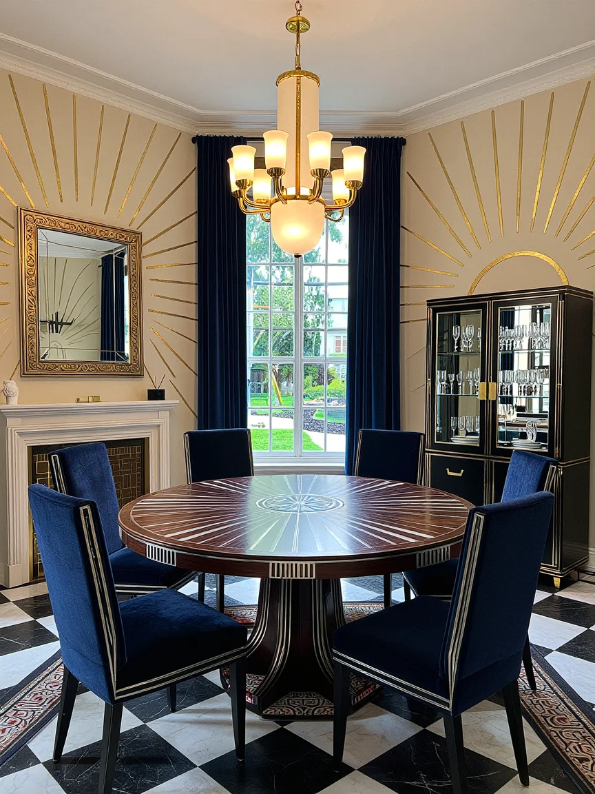 Art Deco dining room with a large circular mahogany table, upholstered high-back chairs in dark blue velvet, geometric wall designs in gold, a brass-framed fireplace, a large mirror with ornate designs, glass-fronted cabinets, an extravagant chandelier, a bay window with velvet drapes, and a checkerboard marble floor.
