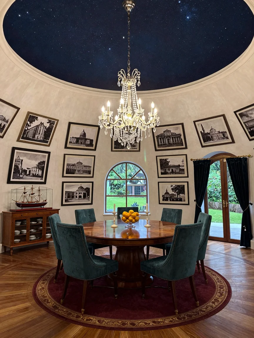 A dome-shaped dining room with a circular mahogany table for six, deep teal upholstered chairs, a centerpiece of citrus fruits and candlesticks, off-white curved walls adorned with black and white architectural photographs, a starry night ceiling with LED lights, a grand chandelier, radial patterned hardwood flooring, a burgundy area rug, a tall mahogany buffet cabinet with fine china, and panoramic windows overlooking lush gardens.