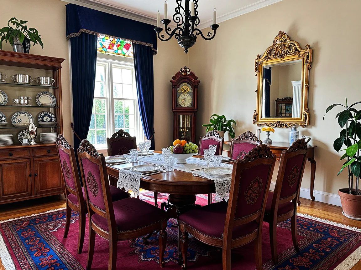 A traditional dining room with a polished oak table, carved wooden chairs with burgundy upholstery, a lace tablecloth, crystal glassware, a gold-framed mirror, wrought-iron chandelier, Oriental rug, mahogany sideboard, grandfather clock, and bright houseplants.