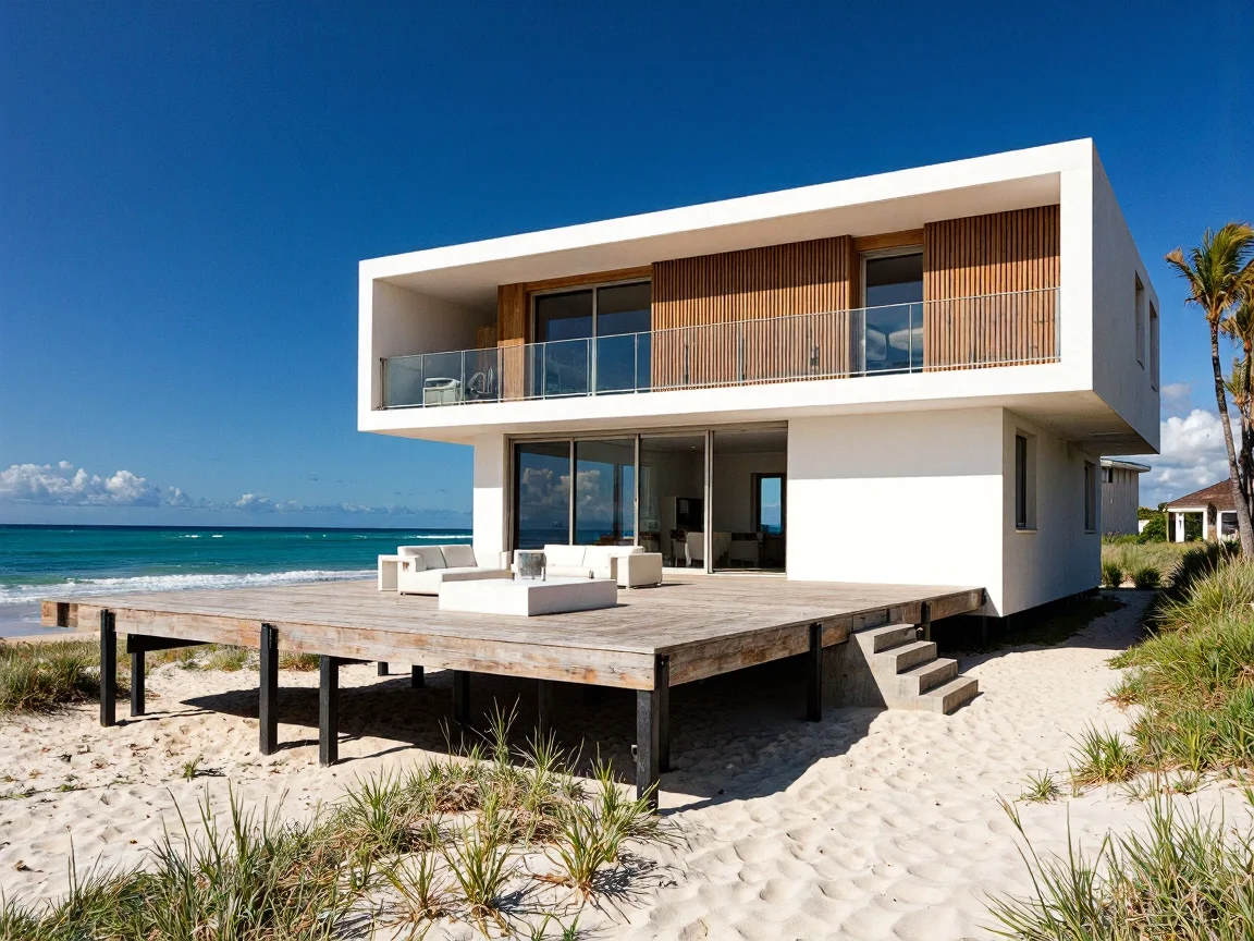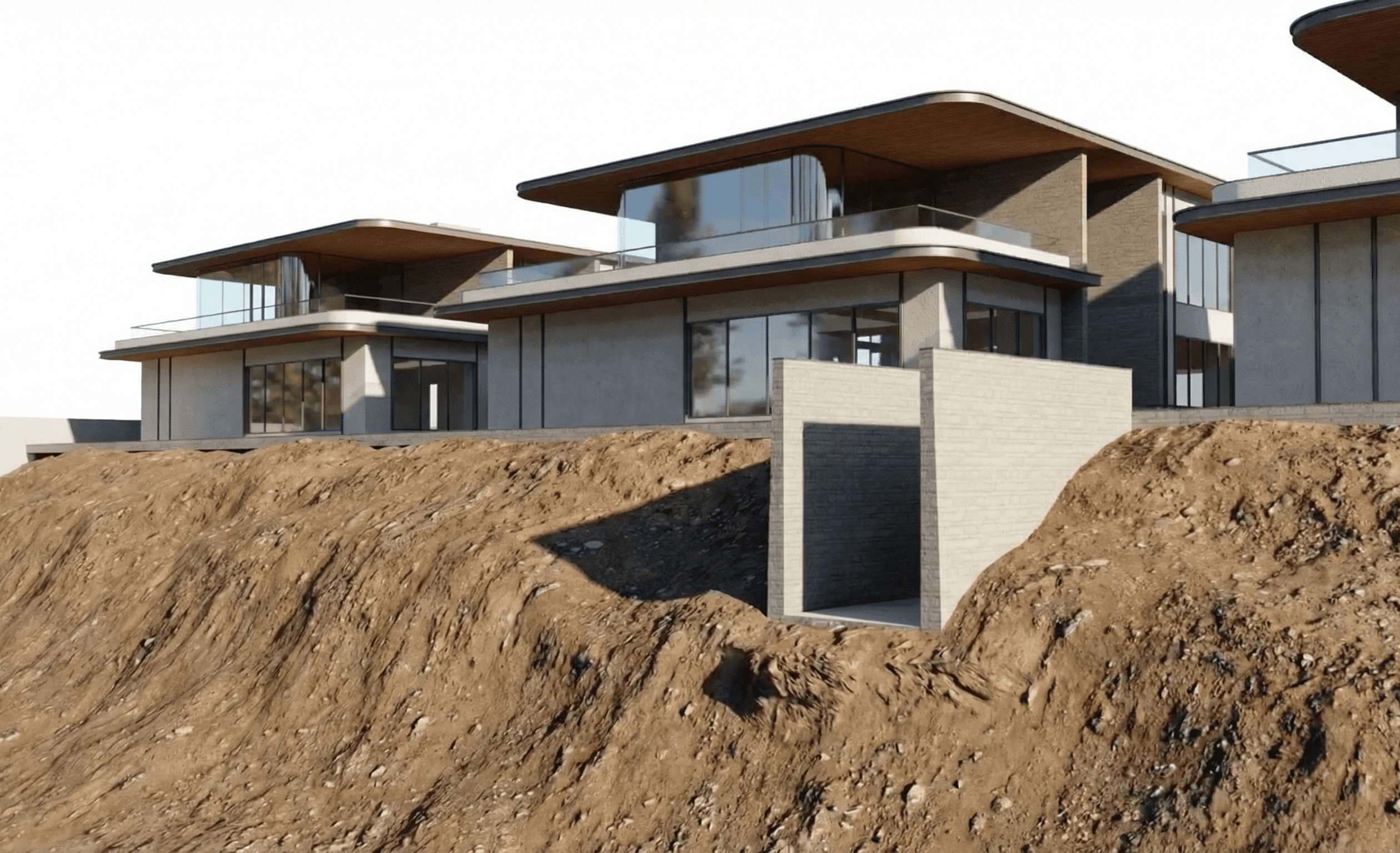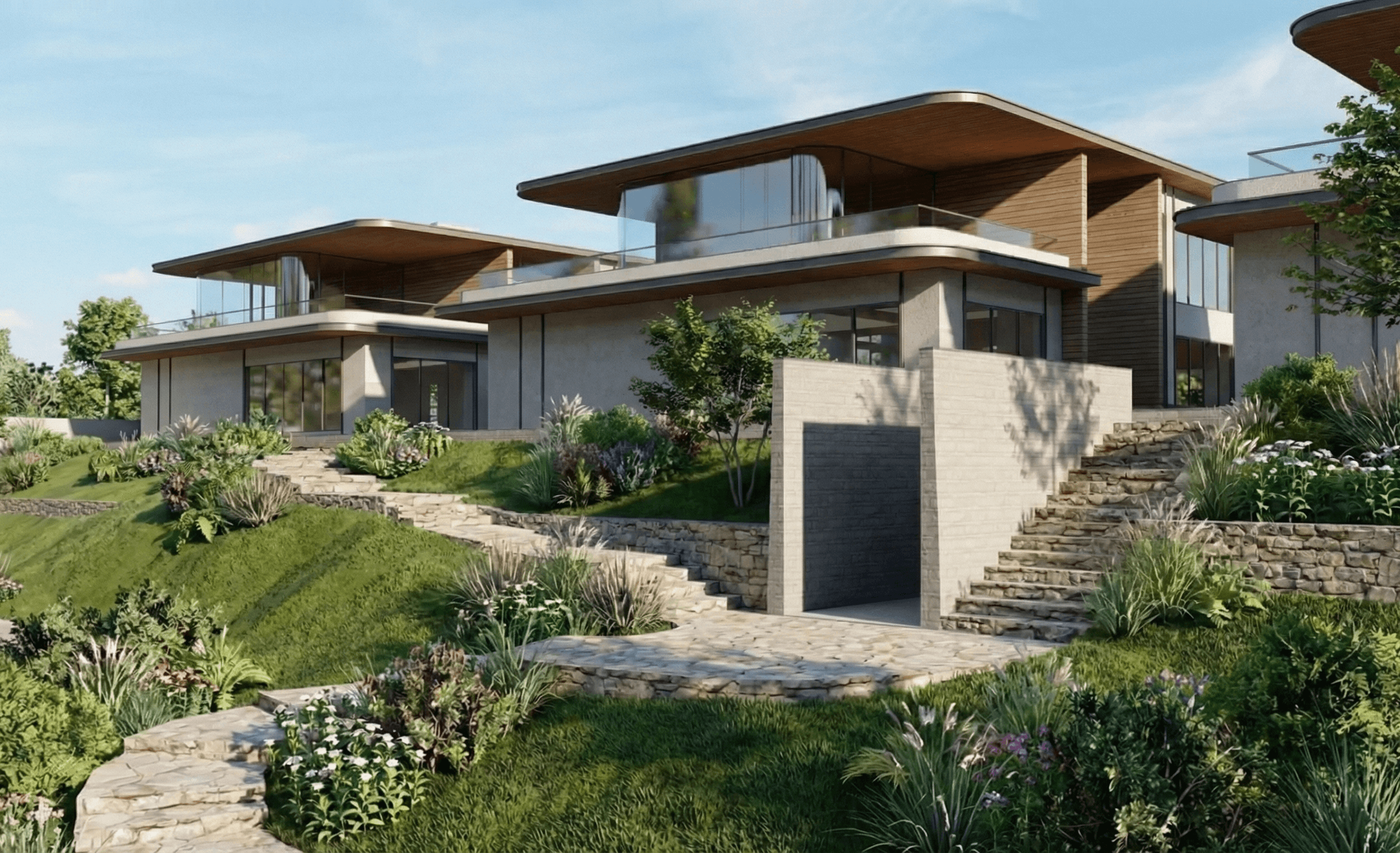 From residential to commercial. Generate comprehensive exterior designs that include the building form, materials, and immediate context.