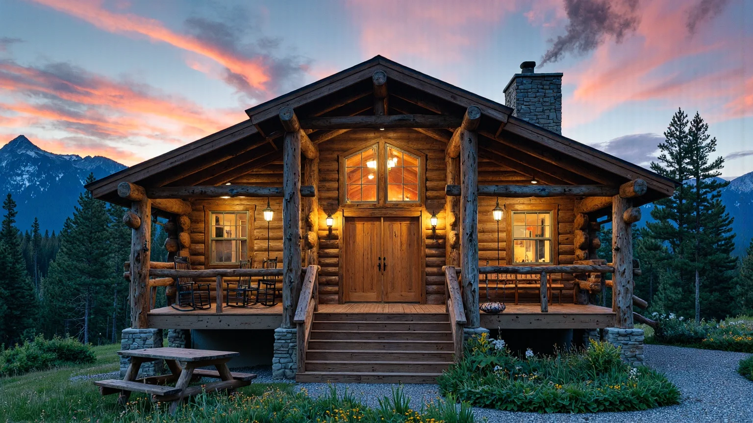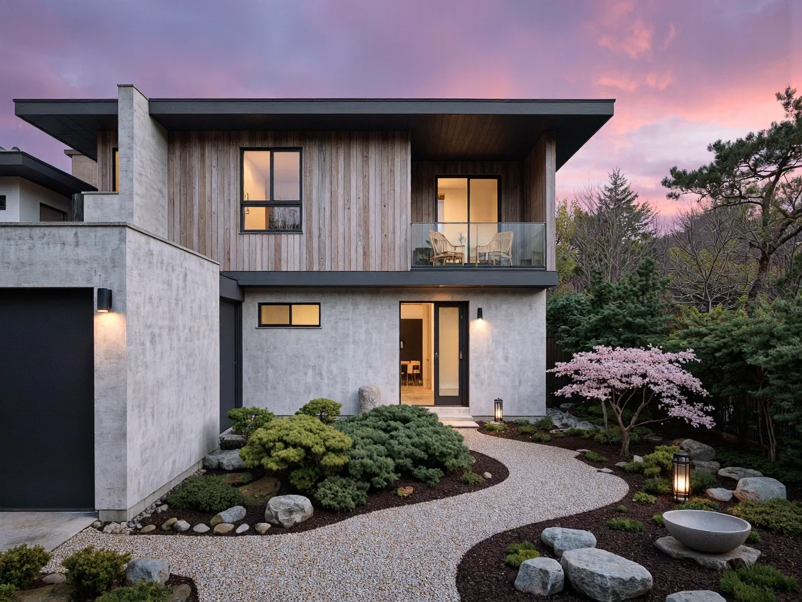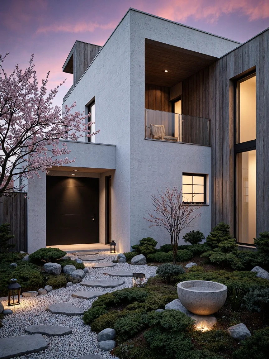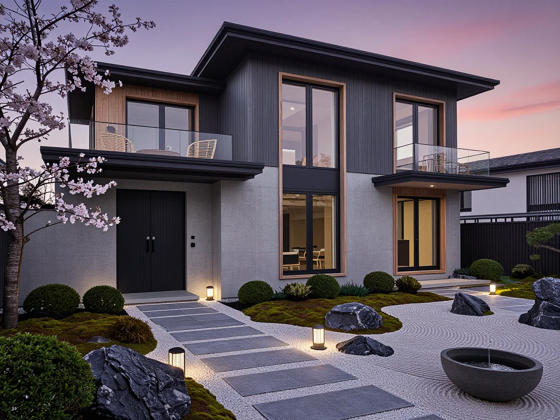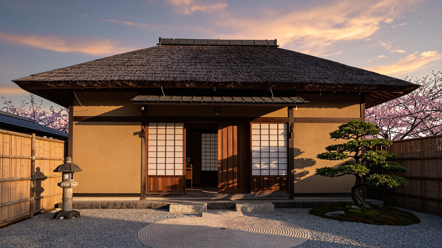 A quaint Japanese exterior design featuring a traditional house with a dark thatched gable roof, warm beige walls, wooden door, and Shoji windows. A gravel pathway leads to the entrance, flanked by stone lanterns, bamboo fence, and a Bonsai tree. Cherry blossom trees add pastel colors, while a sunset sky casts golden light.