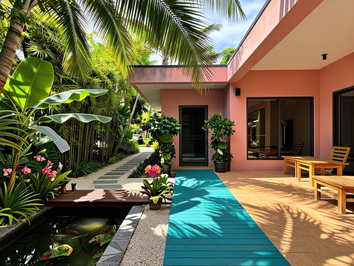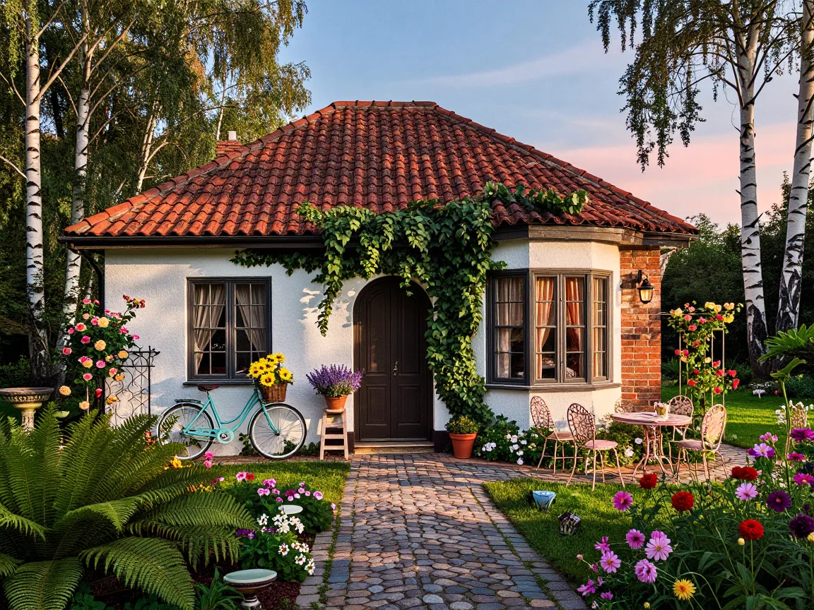 A bohemian styled house exterior with white stucco walls, red clay-tiled roof, and lush natural surroundings. Features include a dark wooden door, bay windows with vintage curtains, a turquoise bicycle with sunflowers, a wooden ladder plant stand, antique lantern, cobblestone pathways, vibrant flowers, pastel patio furniture, climbing roses, and tall silver birch trees under a colorful late afternoon sky.