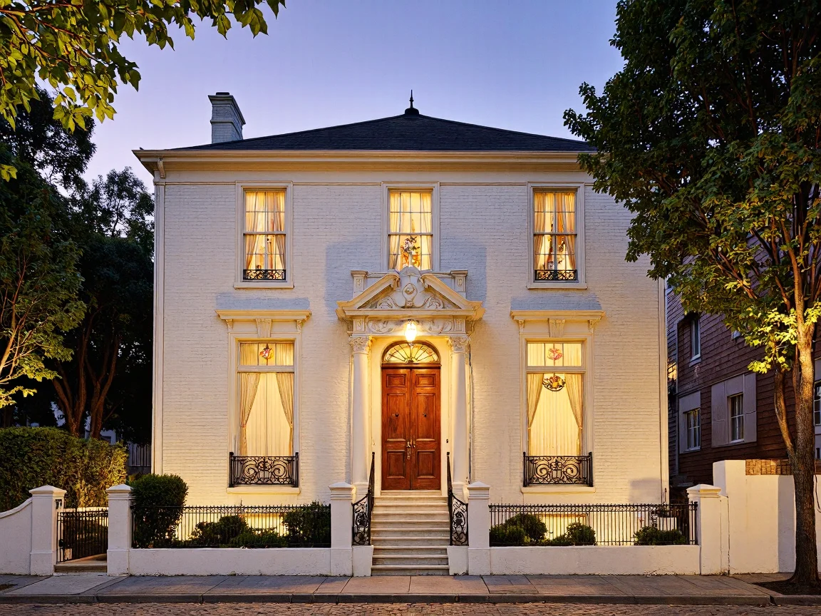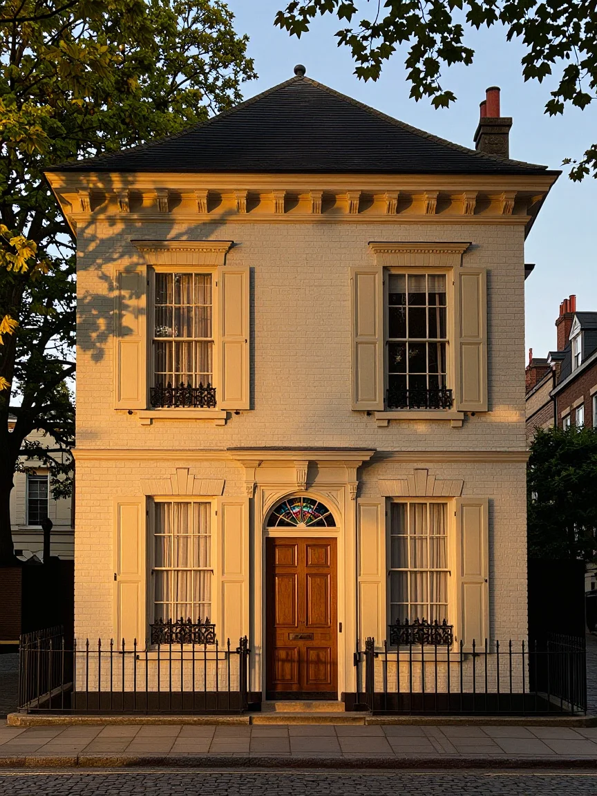 Classic 19th-century Victorian townhouse exterior, soft cream-colored bricks, ornate woodworking, tall narrow windows, mahogany front door, fanlight with stained glass, sash windows with shutters, black iron grills, cornice, black slated pitched roof, wrought iron railings, warm golden light, cobblestone street, lush green trees.