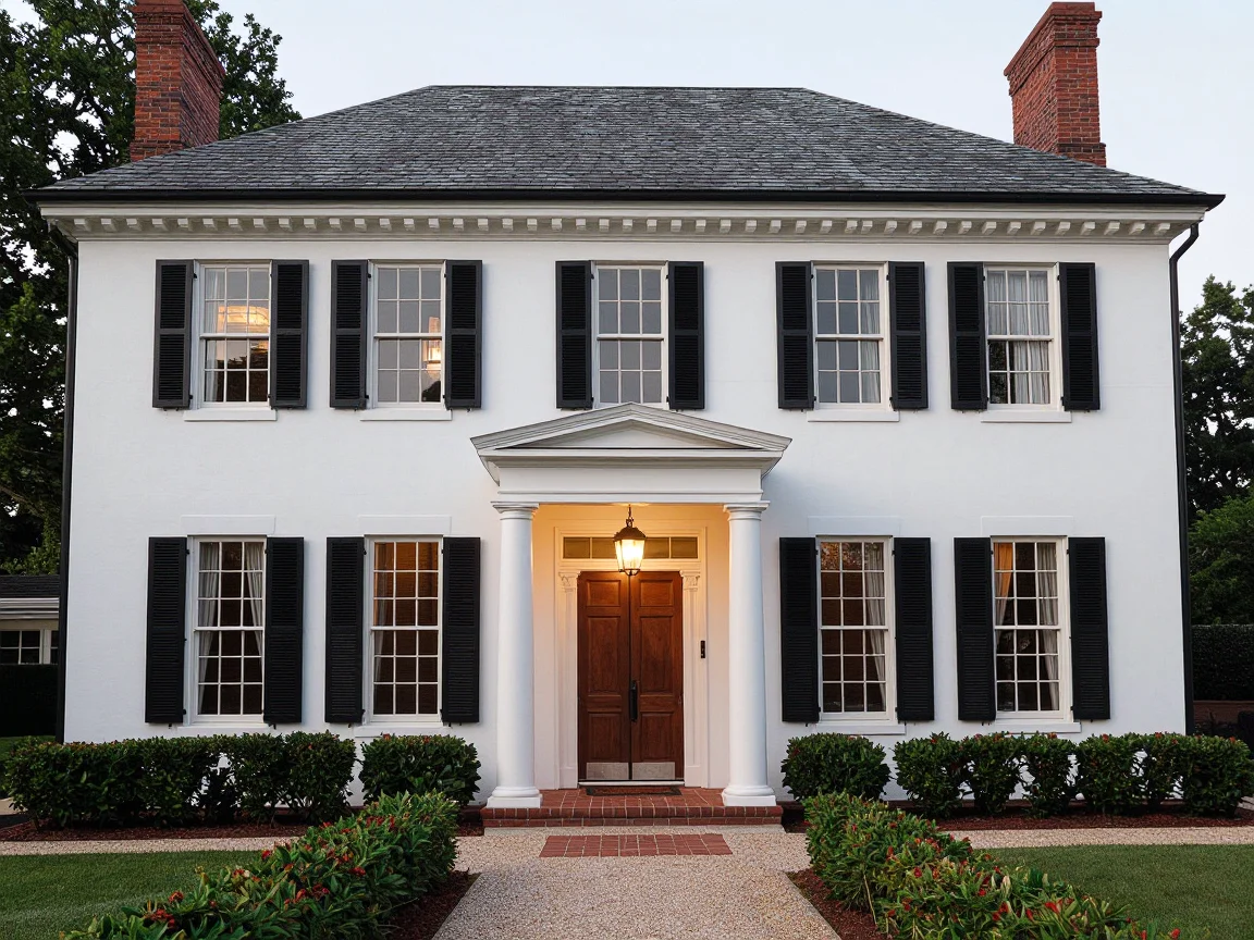 Exterior of a colonial style house with two stories, symmetrical windows, soft white façade, black shutters, six grand columns, double wooden door, matte mahogany finish, ornamental porch light, classic pediment, brick chimneys, slate roof, dentil molding, boxwood shrubs, gravel pathways.