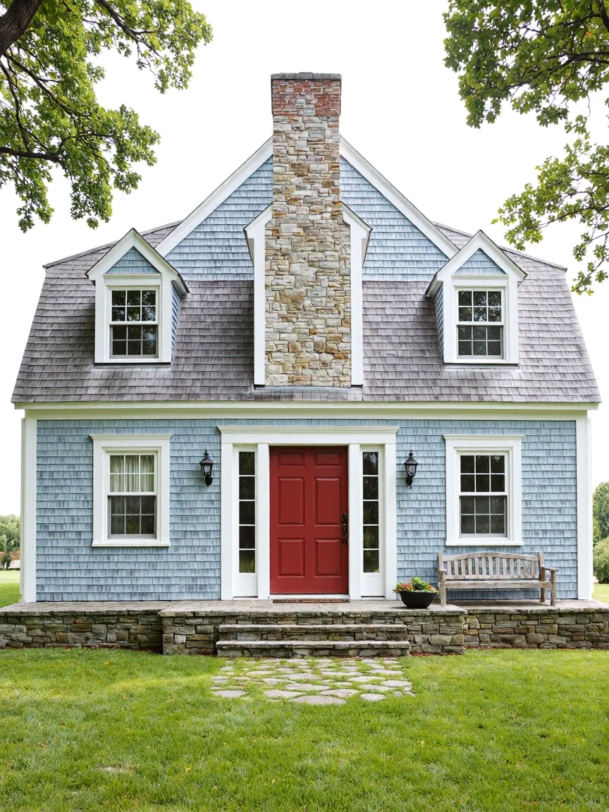 A traditional two-story vernacular house made from rustic stone slabs in shades of grey and brown, with a steeply pitched wooden shingle roof, a spacious porch with cobblestone flooring, white-framed windows, and an oak entrance door, surrounded by a landscaped garden.