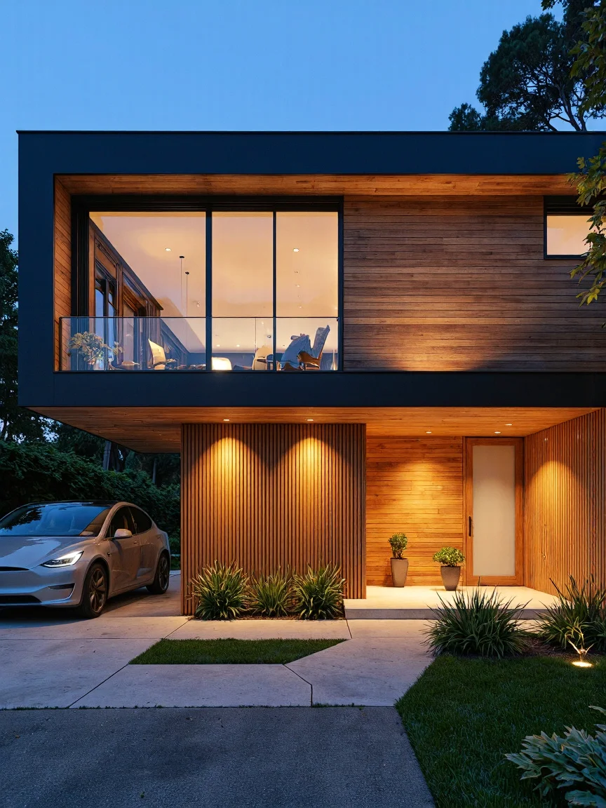 A sleek two-story contemporary house with wooden paneling and glass windows in a green environment, featuring a full-height glass window, a cantilevered second floor, and a welcoming entrance with a wooden door, surrounded by low-maintenance shrubbery and a Tesla Model S parked in the driveway, all under gentle dusk lighting.