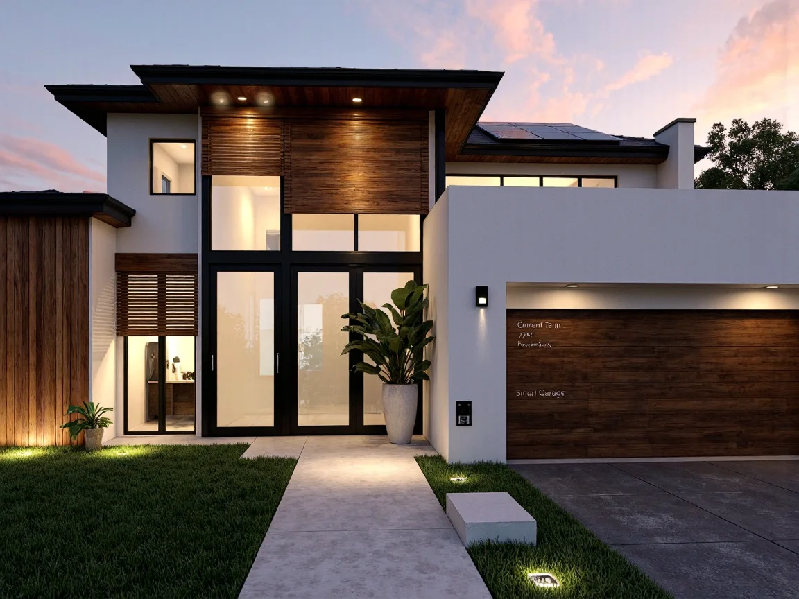 Modern smart home exterior in suburban setting during golden hour, two stories, mid-century modern style, white walls with dark wood accents, large pivot door with frosted glass, electronic entry system, tall potted plant, floor-to-ceiling windows, automated window shades, vertical wooden slats, concrete pathway with LED lights, solar panels, digital weather station, two-car garage with automated doors.