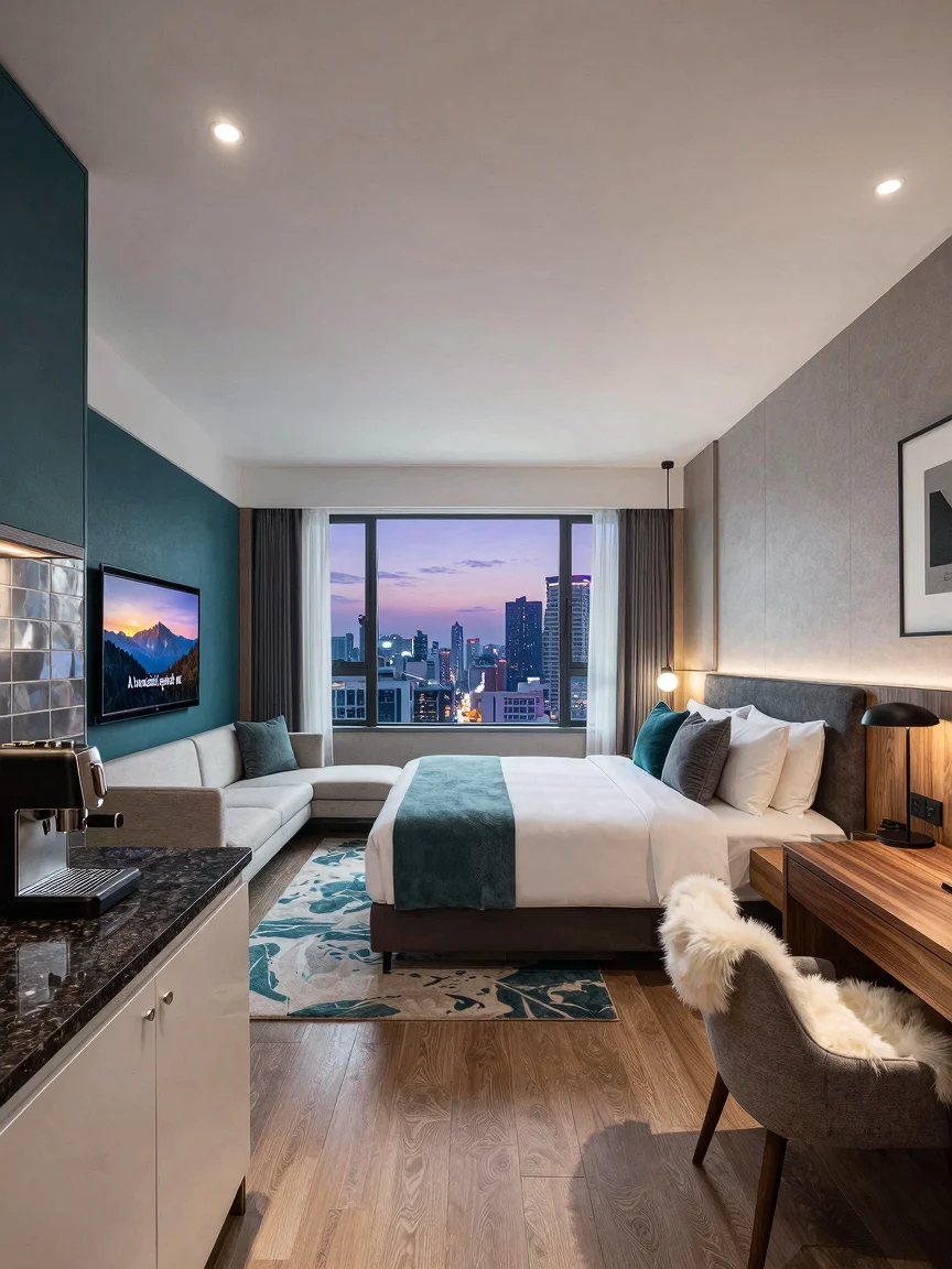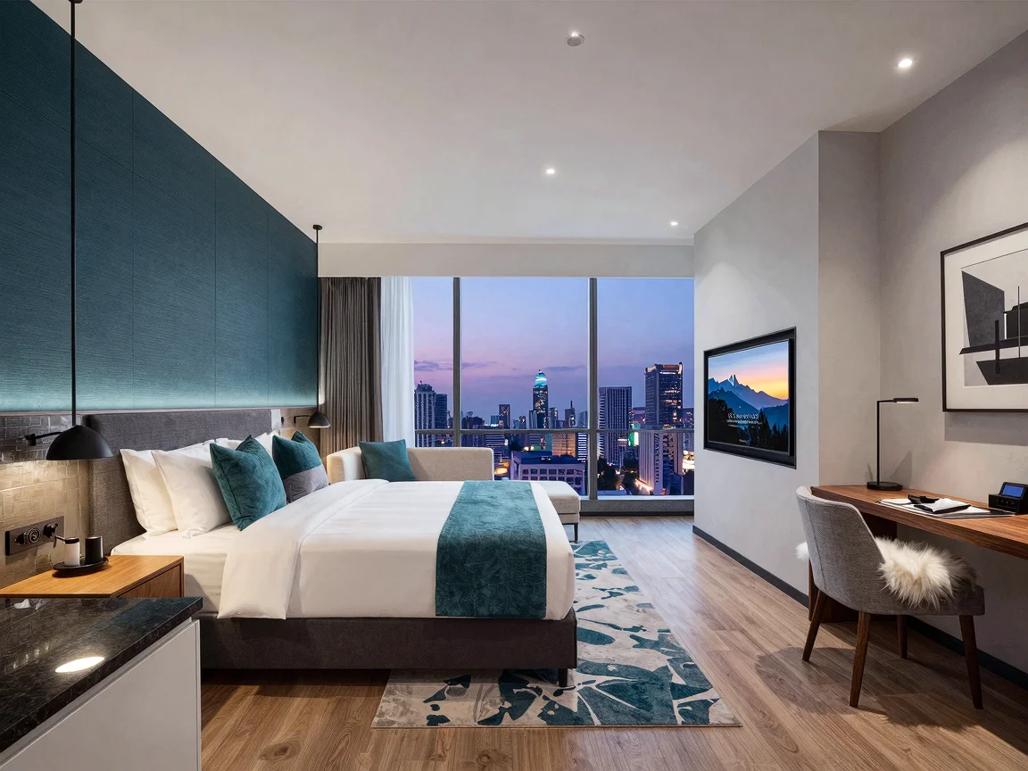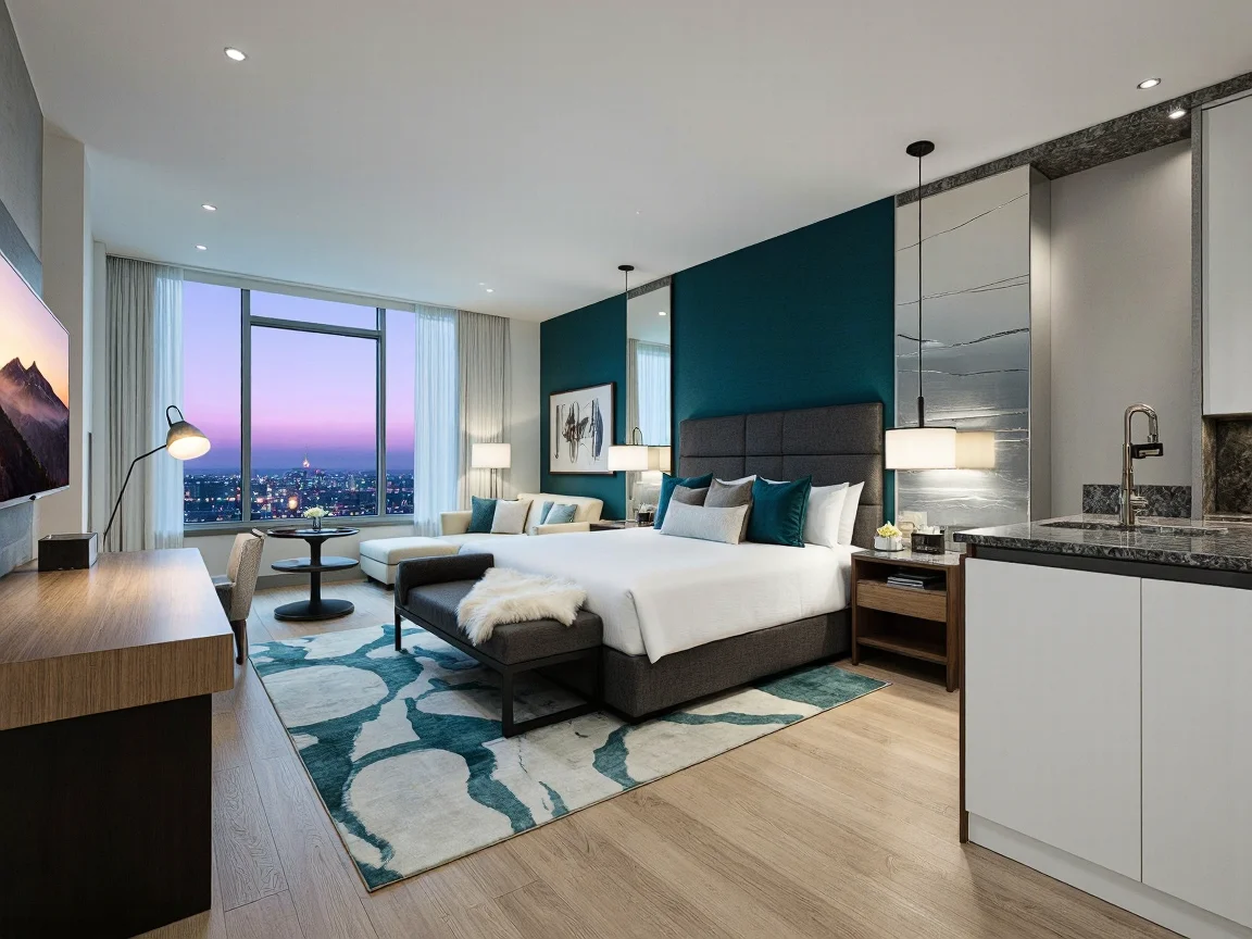 Contemporary hotel room with king-sized bed, charcoal gray headboard, white linens, teal and gray throw pillows, floating bedside tables, sleek sectional sofa, large flat-screen TV, panoramic city skyline views, espresso bar, deep teal accent wall, walnut desk and chair with fur throw.