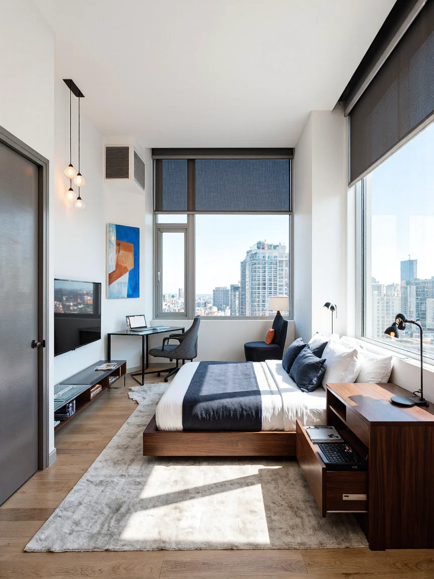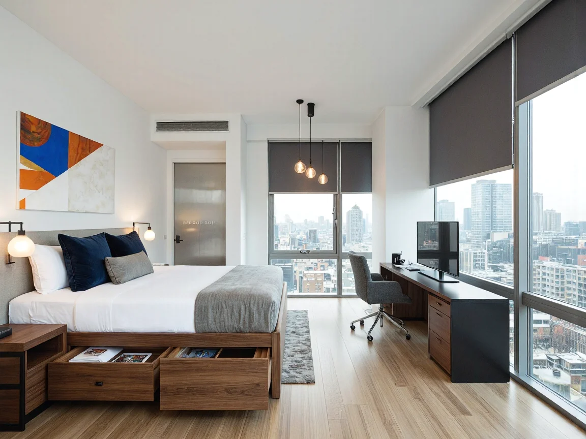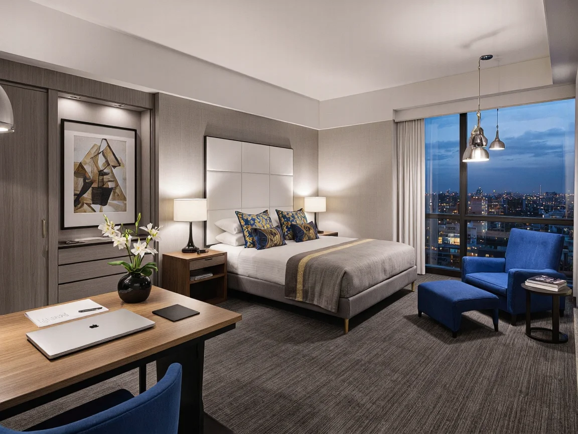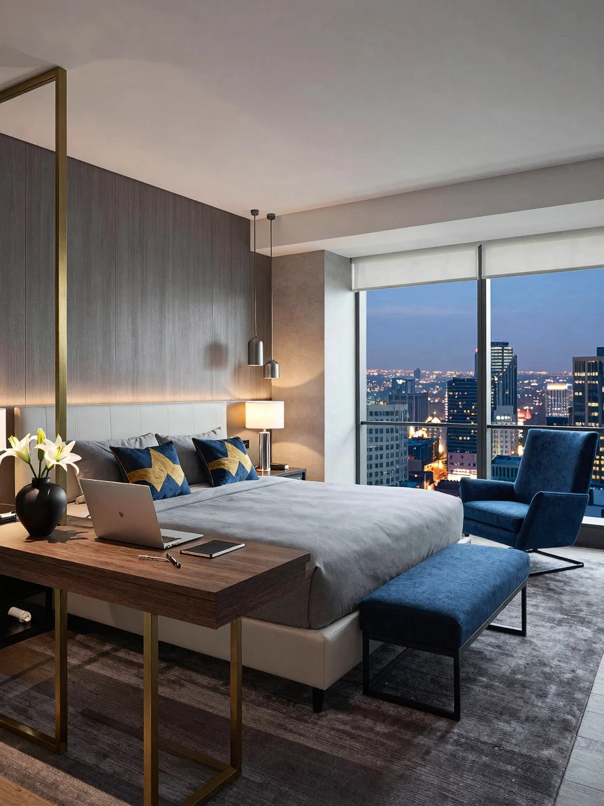 Contemporary hotel room with king-sized bed, charcoal gray headboard, white linens, teal and gray throw pillows, floating bedside tables, sleek sectional sofa, large flat-screen TV, panoramic city skyline views, espresso bar, deep teal accent wall, walnut desk and chair with fur throw.
