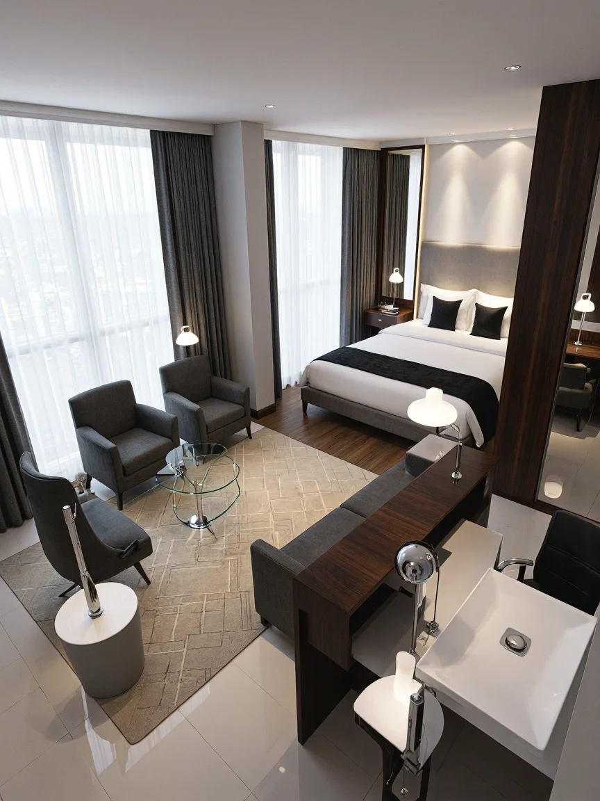 Create the guest experience. Visualize standard rooms, suites, and bathrooms with hospitality-grade furniture and finishes.