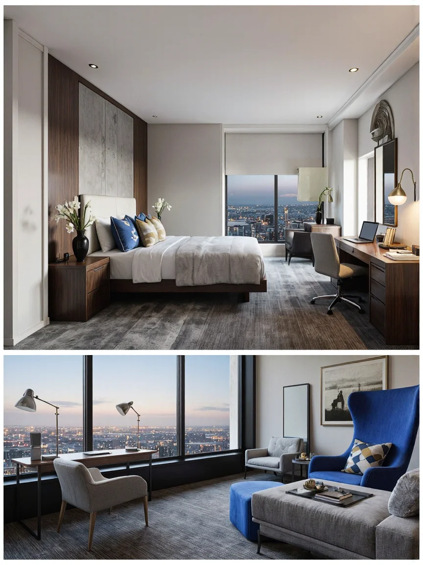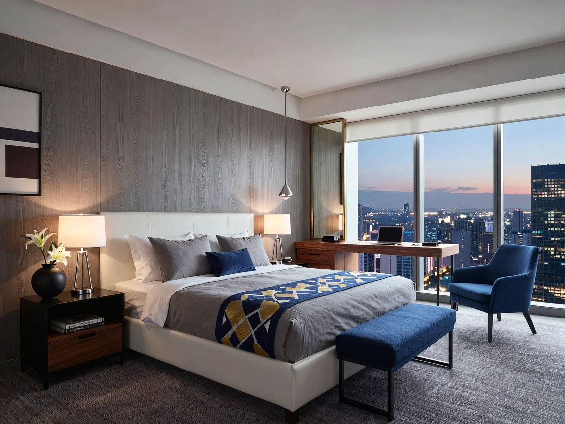 Contemporary hotel room on uppermost floor with city view, featuring king-size bed, minimalist desk, lounge chair, and expansive glass window. Neutral color palette with grey walls, white ceiling, and deep carpets. Artistic ash-grey teak panel and walnut console table enhance the design.