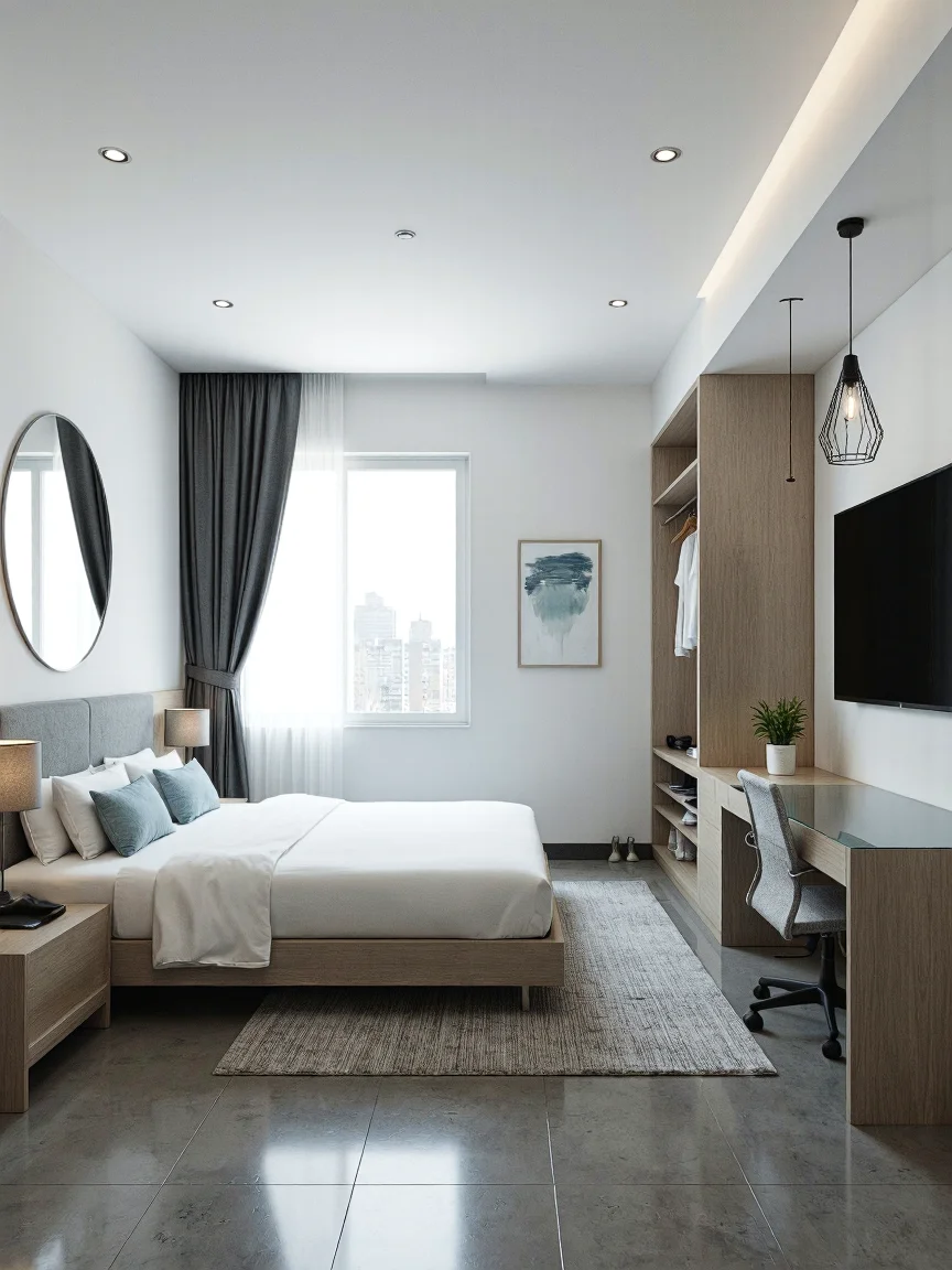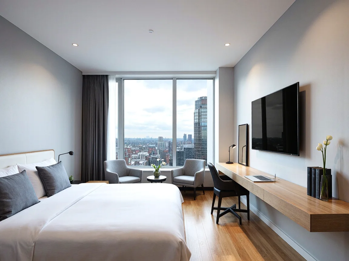 Modern hotel room with Scandinavian design, central king-sized bed, oak writing desk, ergonomic black chair, wall-mounted TV, floating shelf with decor, sitting area with gray armchairs, floor-to-ceiling window, warm lighting, light gray walls, honey-toned hardwood floor, full-length mirror.