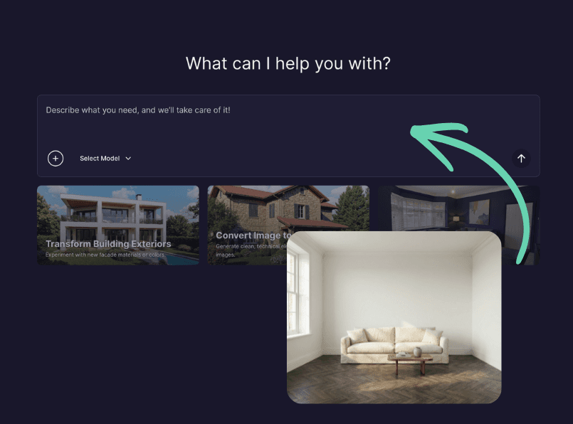 The ultimate tool for any room. Upload a photo of any space and redesign it completely with AI, controlling style, furniture, and finishes.