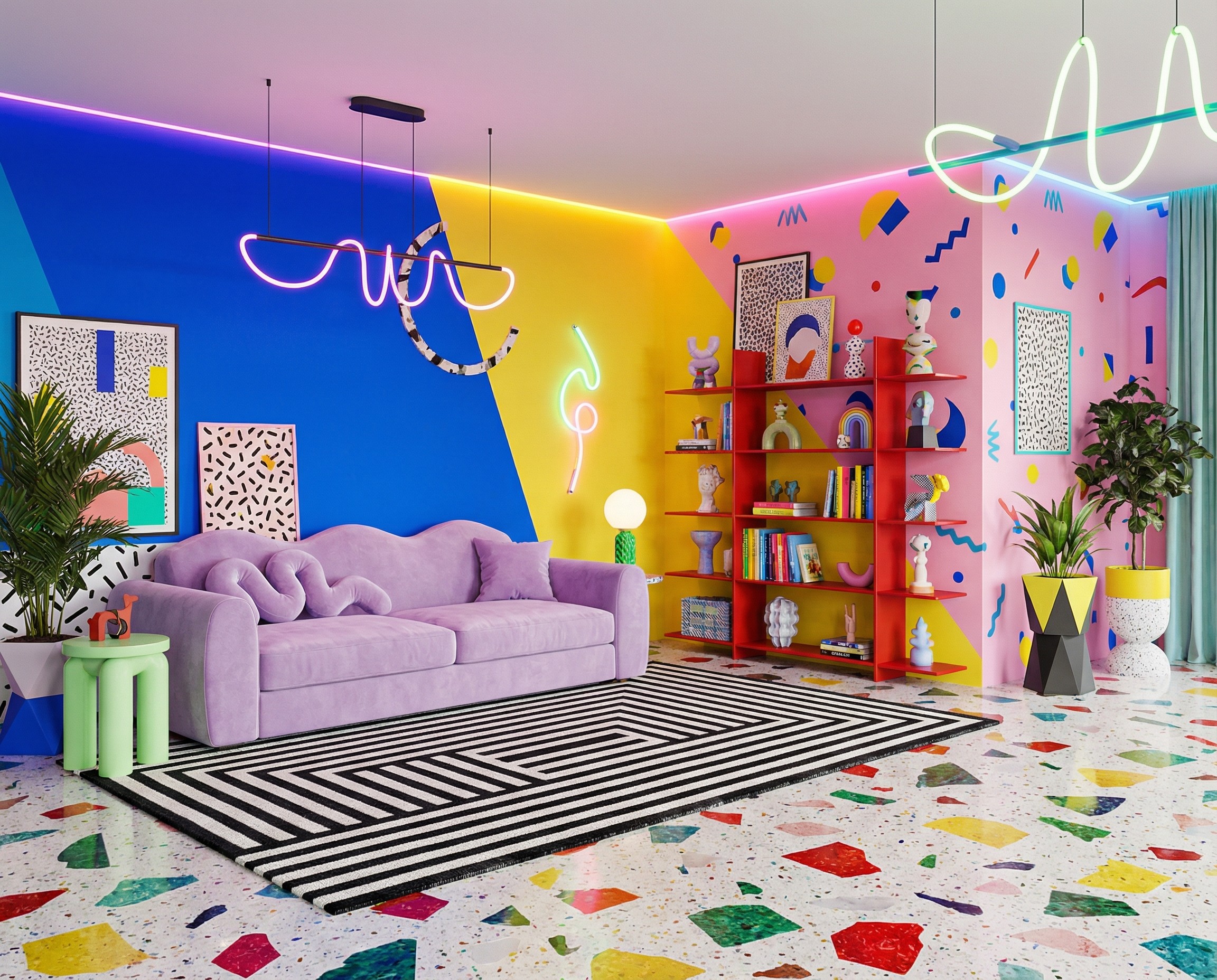 Expressionist living room with vibrant colors like cobalt blue, carmine red, emerald green, and lemon yellow. Glass north wall, abstract mural on east wall, dark oak flooring, angular emerald green sofa, carmine red armchair, asymmetric bookshelf, geometric floor lamps, minimalist black marble fireplace.