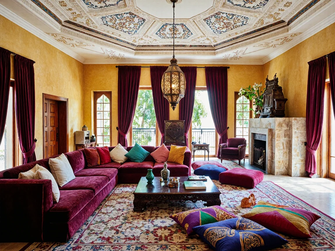 A richly decorated Moroccan living room featuring a large burgundy velvet sofa, a geometrically patterned coffee table, warm mustard-yellow walls with traditional carvings, a high dome-shaped ceiling with arabesque motifs, an ornate wrought iron lantern, walnut double doors leading to a balcony, tall windows with purple curtains, a dramatic stone fireplace with Zellige tiles, an oversized Persian carpet, and plush jewel-toned cushions.