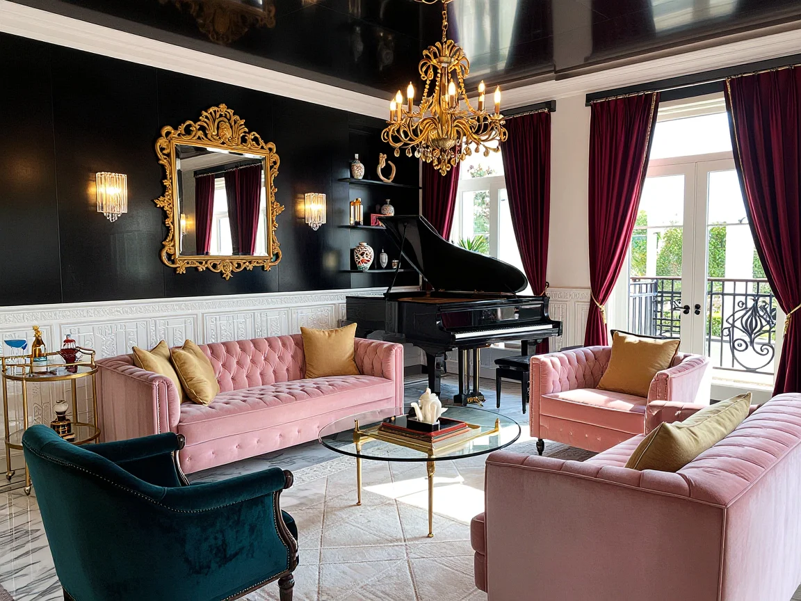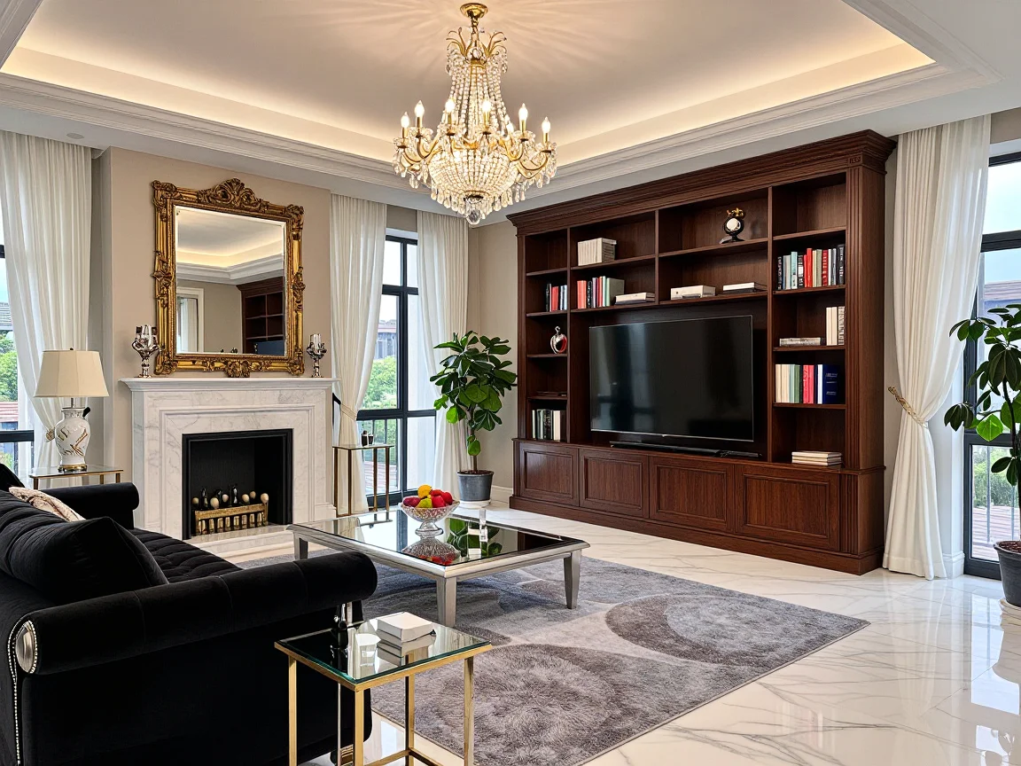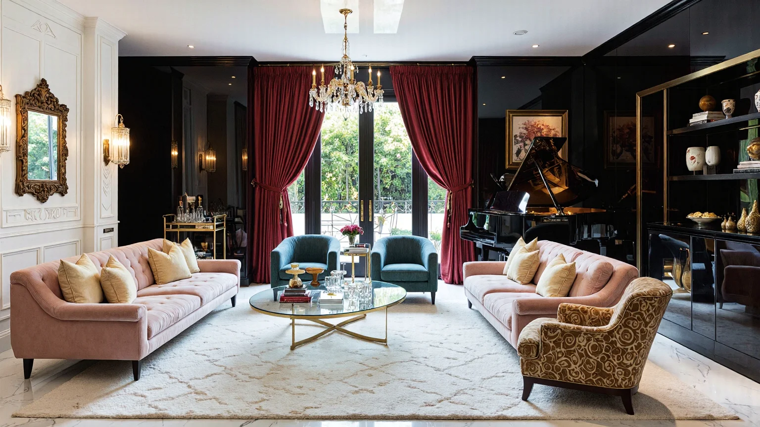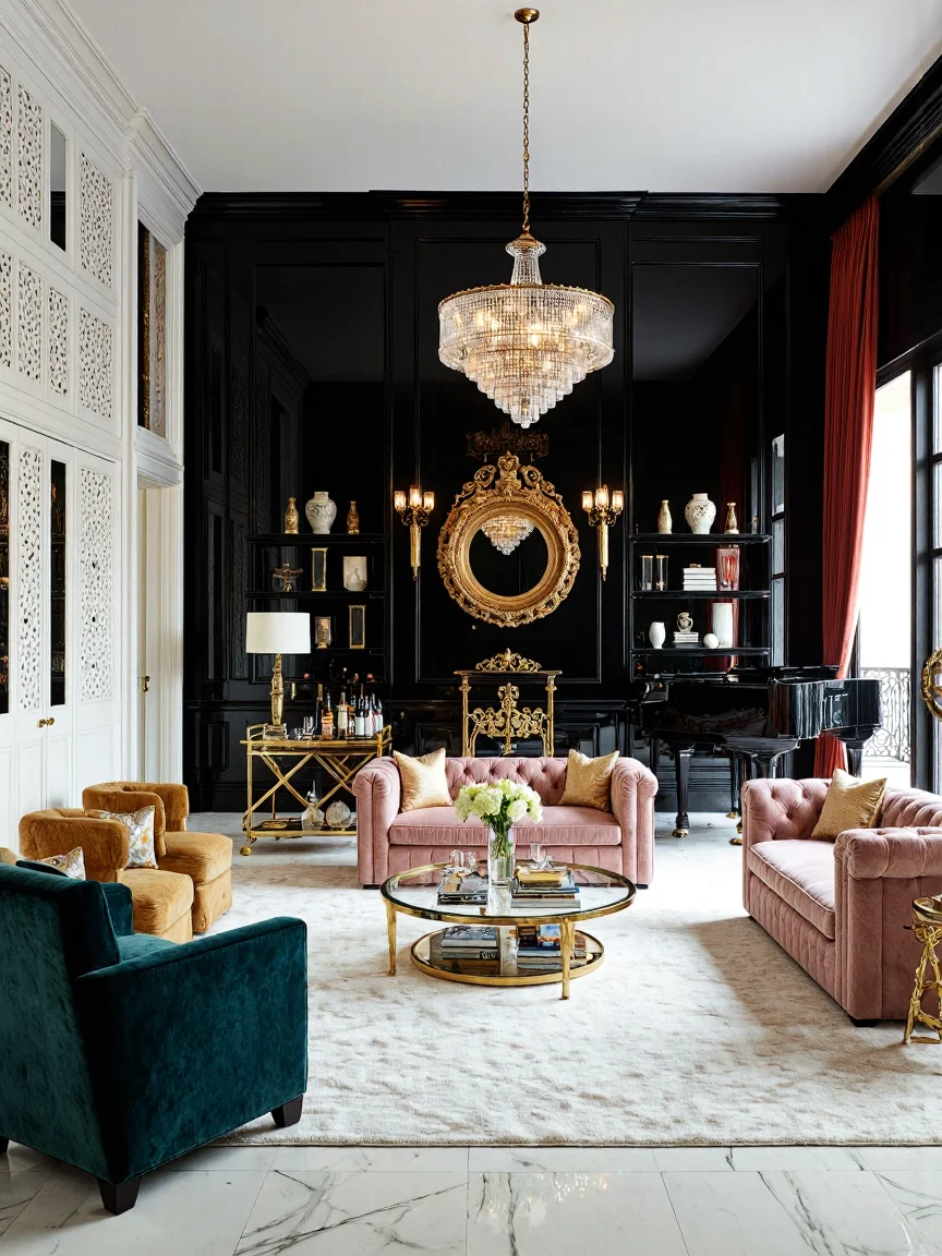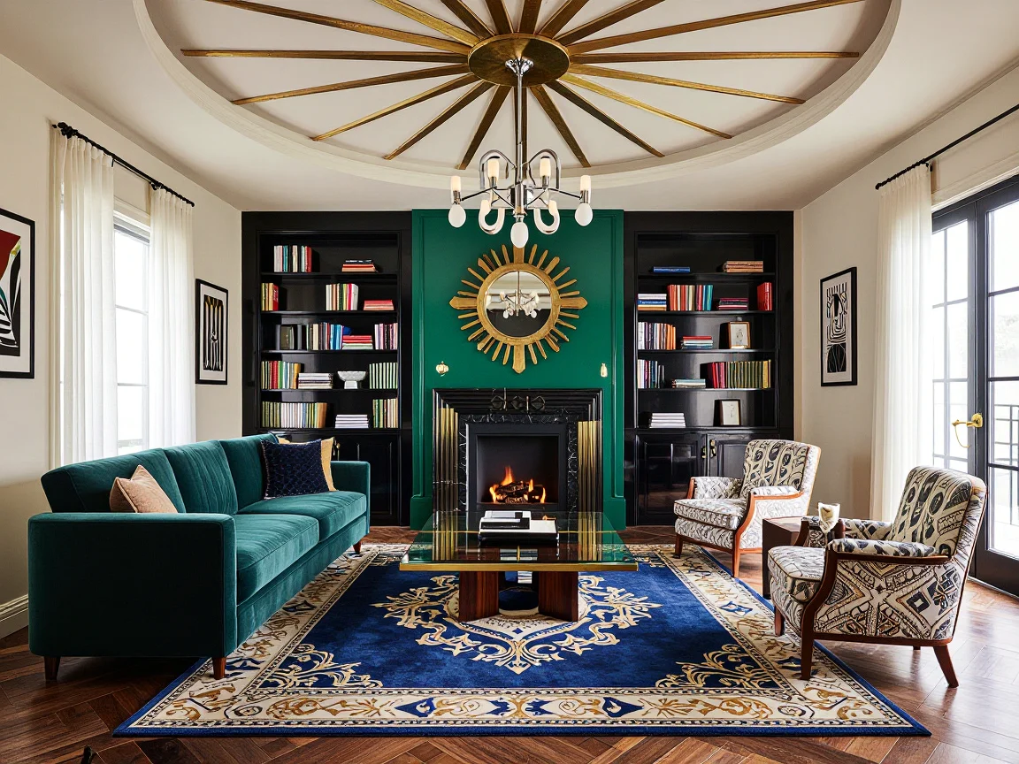 A spacious Art Deco living room featuring a sunburst ceiling, chrome chandelier, teal velvet sofa, emerald green fireplace, and a large coffee table made of glass, brass, and dark mahogany. Decorated with a peacock patterned rug and built-in black bookcases, the room has sheer white curtains and geometric art on cream walls.