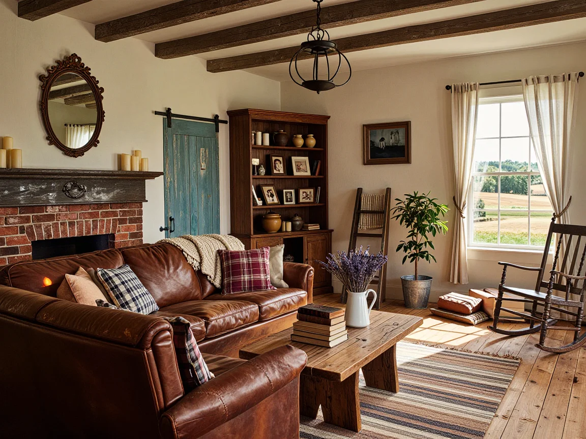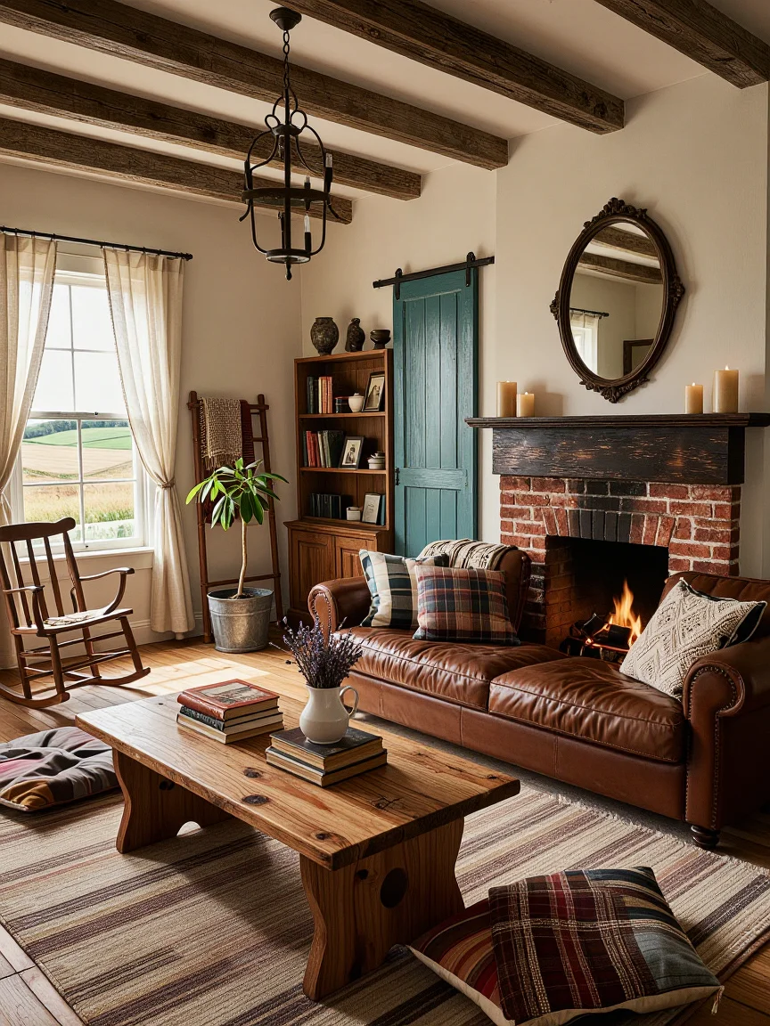 A traditional farmhouse living room featuring a worn brown leather couch with plaid pillows, a rustic wooden coffee table, an exposed red-brick fireplace, and an antique bookshelf. Decor elements include a barn door, a ladder blanket holder, and a rocking chair with a view of farm fields.