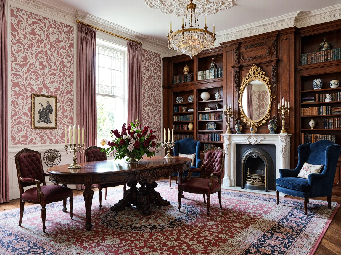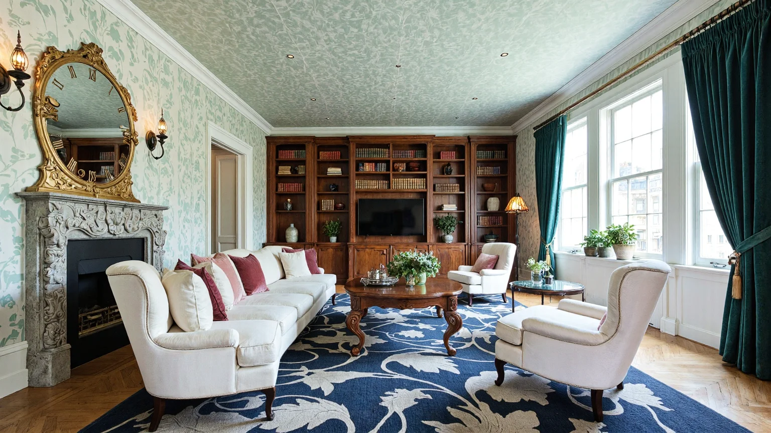 Elegant Art Nouveau-inspired living room with high ceilings, large windows, flowing natural patterns on wallpaper, walnut oval coffee table, cream silk sofa, blush pink armchairs, ornate fireplace, mahogany bookcase, antique decor, wool rug with floral motifs, modern TV, and forest-green velvet curtains.
