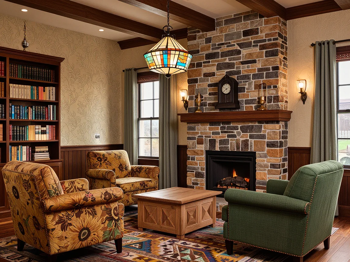 Craftsman living room featuring a large stone fireplace, dark oak mantle with vintage clock and candlesticks, oak coffee table with geometric carvings, pairs of plush armchairs in warm-toned floral fabrics, a mahogany bookshelf with books, beige-textured wallpaper, patchwork rug, sage green curtains, antique brass sconces, and an art glass pendant light.