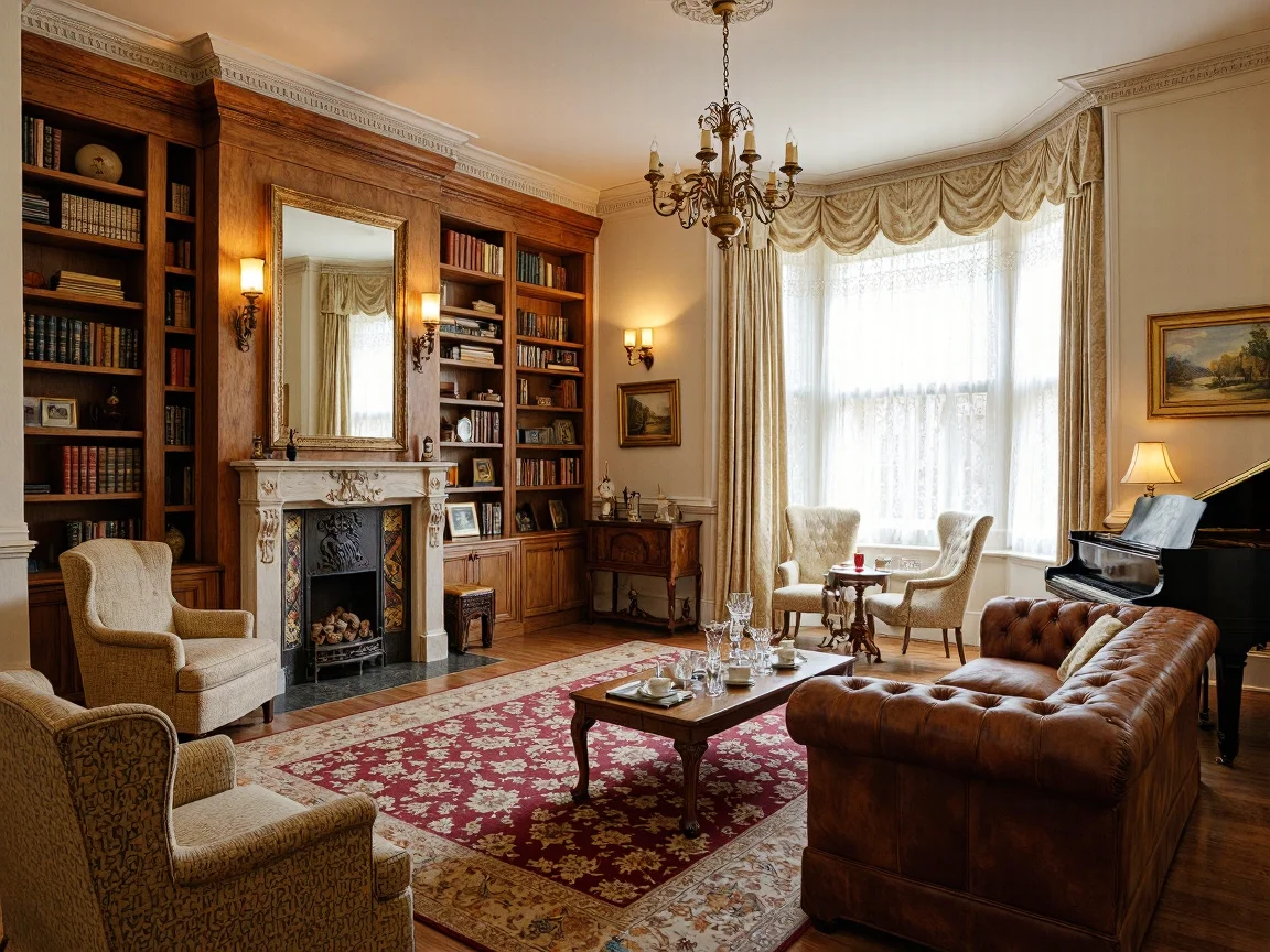 Elegant Art Nouveau living room with high ceilings, large windows, pastel wallpaper, walnut coffee table, cream silk sofa, blush pink armchairs, ornate fireplace, mahogany bookcase, antique clock, wool rug, recessed lights, modern TV, potted succulents, vintage floor lamp, forest-green velvet curtains.