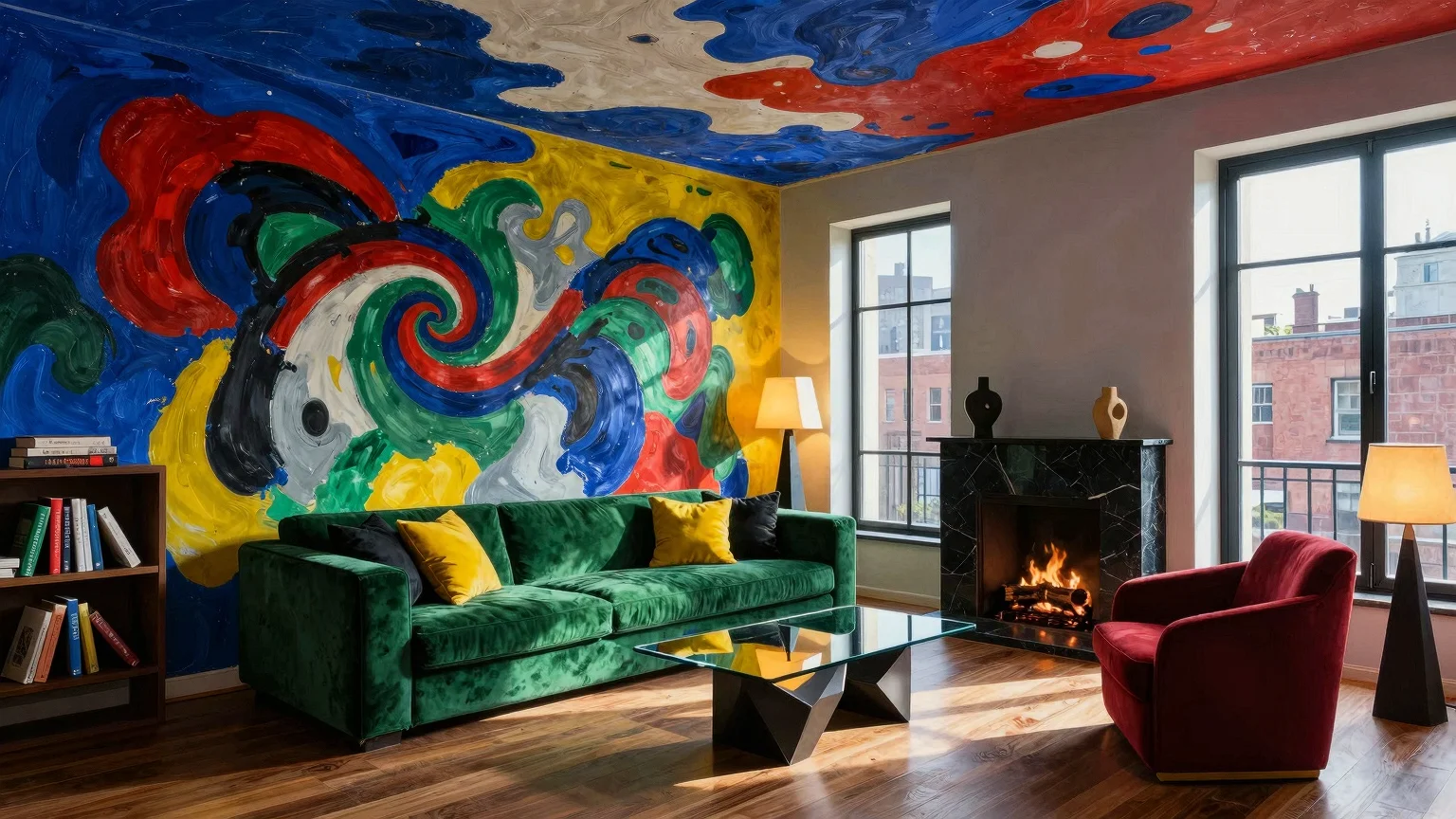 Expressionist living room with vibrant colors like cobalt blue, carmine red, emerald green, and lemon yellow. Glass north wall, abstract mural on east wall, dark oak flooring, angular emerald green sofa, carmine red armchair, asymmetric bookshelf, geometric floor lamps, minimalist black marble fireplace.