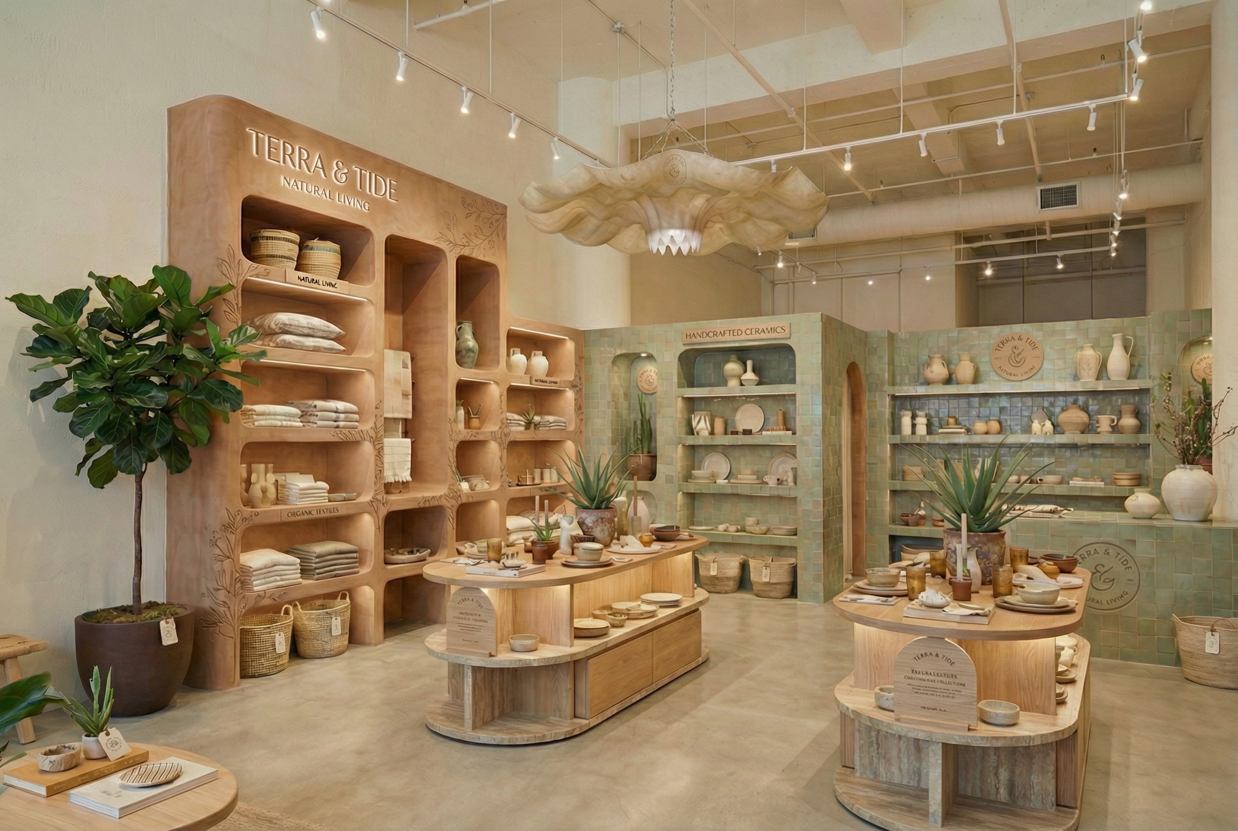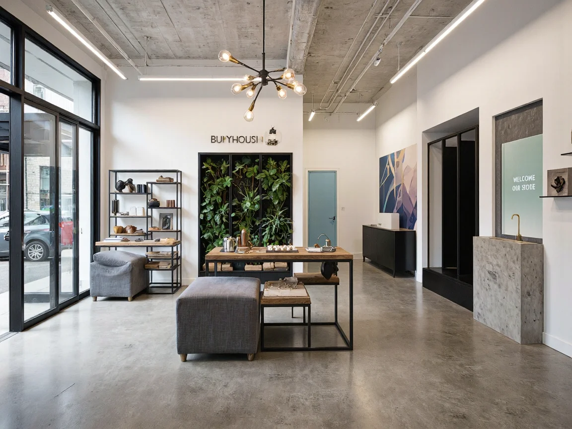 Contemporary retail store with clean lines and minimalist design. Soft white walls, geometric matte black shelves, large glass storefront, polished concrete flooring. Center island display table of reclaimed wood and steel with pendant lights. Dark green living wall, gray seating area, polished concrete checkout counter with embedded screen. Back wall mural of abstract geometric pattern and fitting rooms with blue doors. LED strip lighting throughout.
