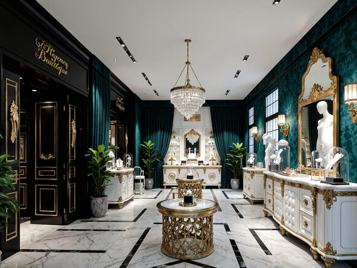 A Hollywood Regency style retail store with a grand open layout, high ceilings, and large windows. Features luxurious entrance doors, teal velvet wallpaper, black-and-white marble flooring, gold-framed mirrors, baroque-style furniture, and a grand chandelier. Overall palette includes teal, white, black, and gold.