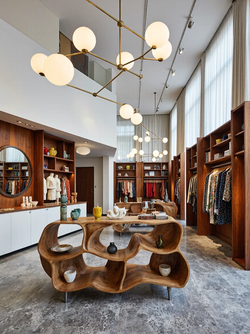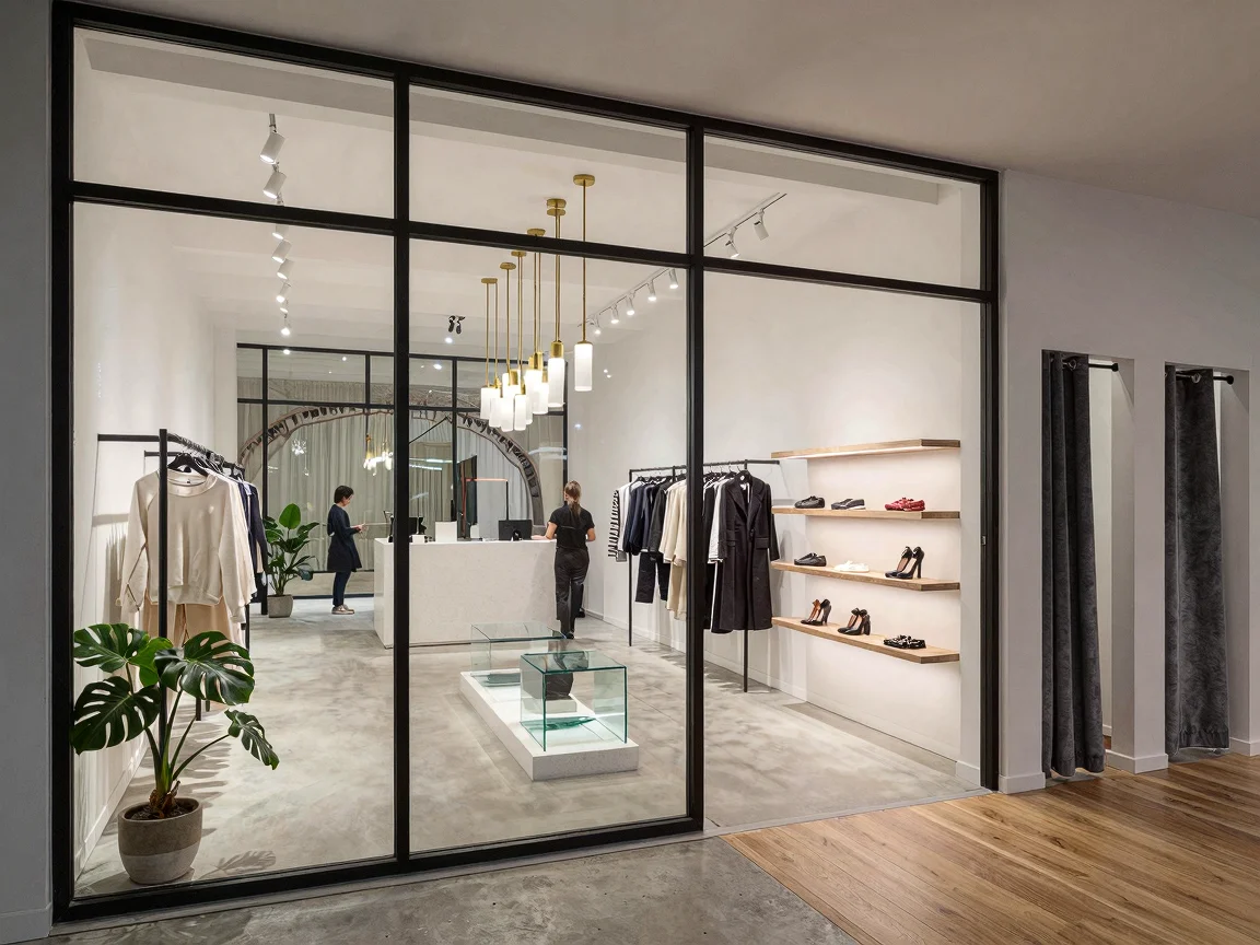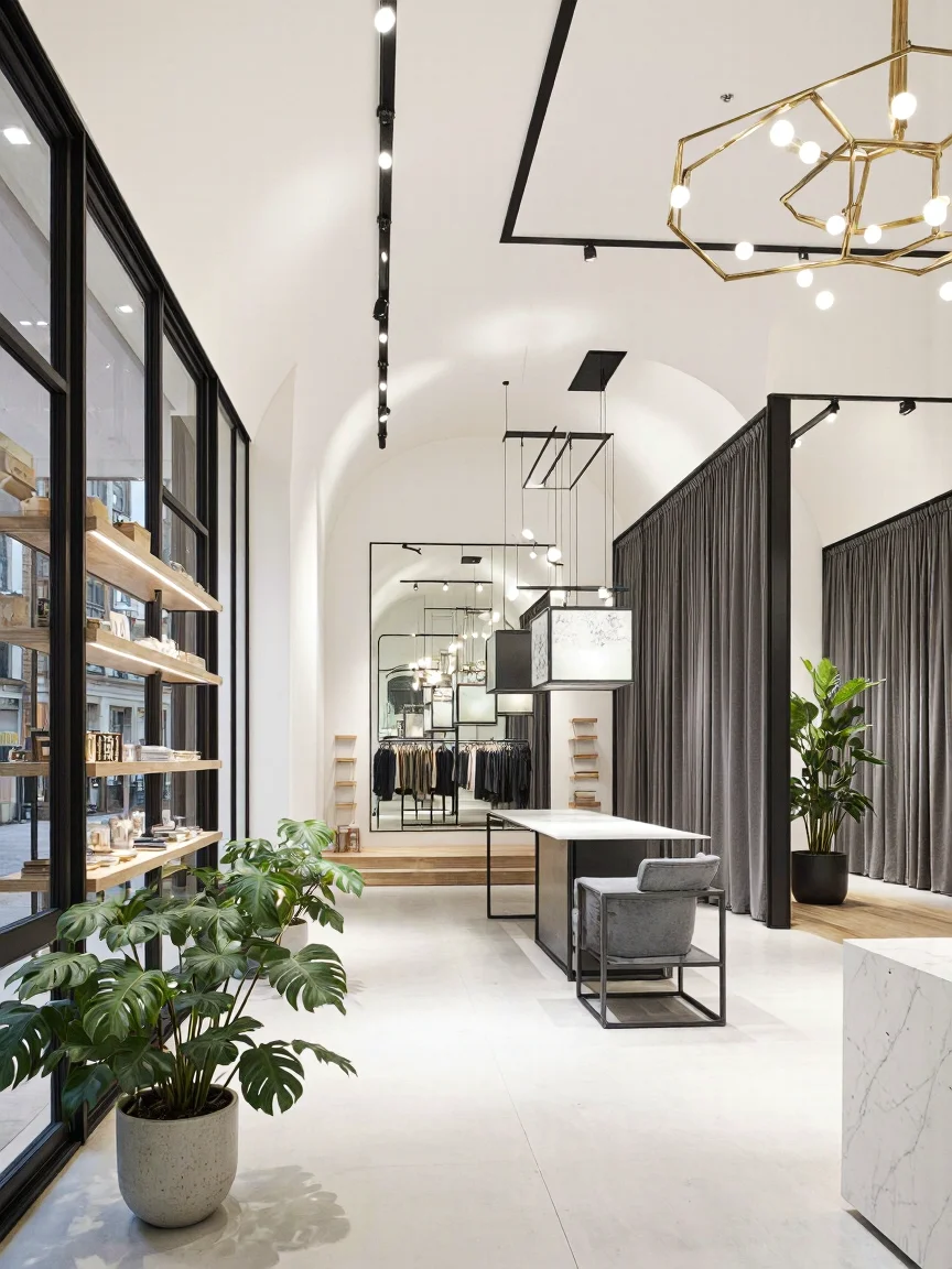 Contemporary retail store design with large glass windows, neutral color palette, ash wood shelves with LED lighting, matte black racks, quartz counter, mural mirror, floating glass display units, oak flooring, velvet fitting room curtains, potted monstera plants, adjustable track lighting, and a geometric chandelier.
