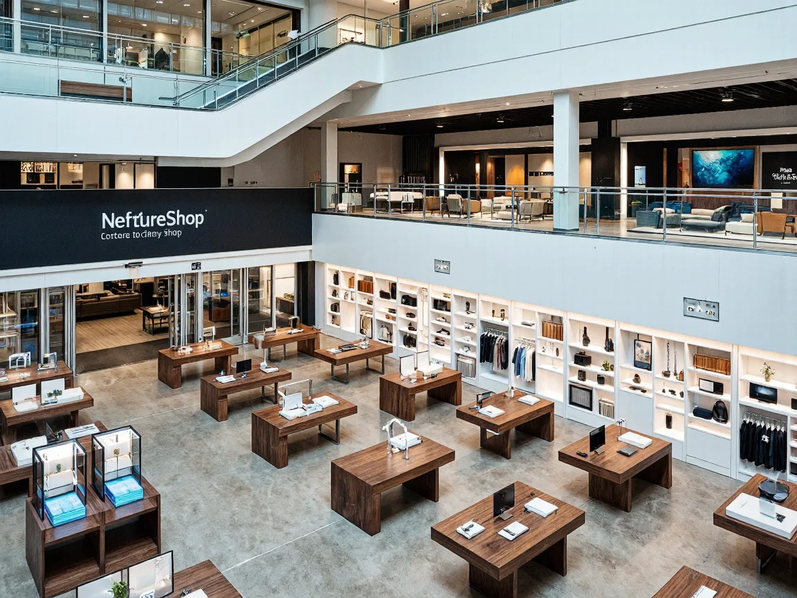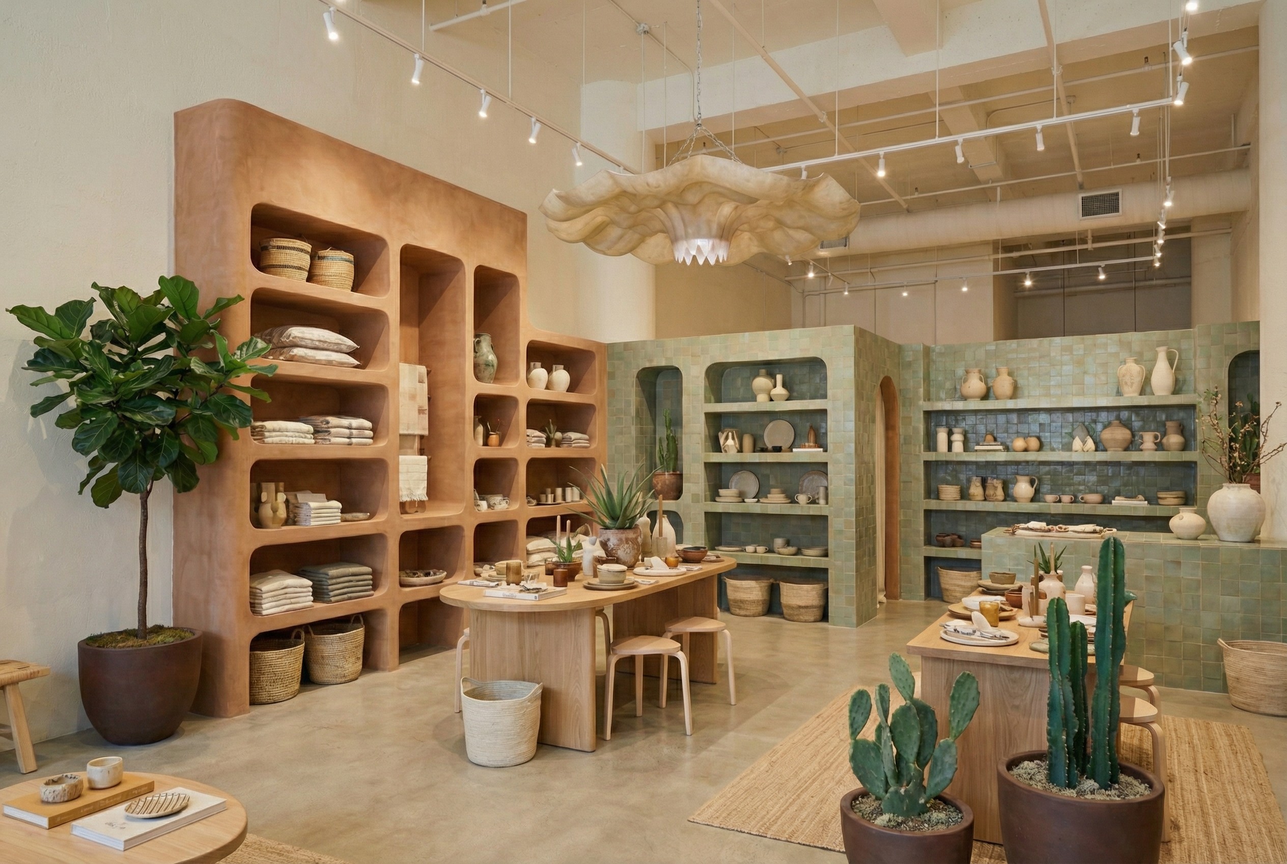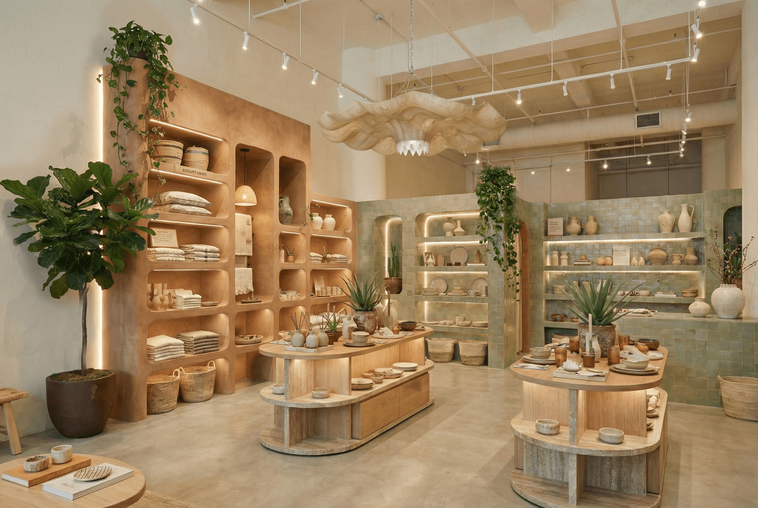 Contemporary retail store design with large glass windows, neutral color palette, ash wood shelves with LED lighting, matte black racks, quartz counter, mural mirror, floating glass display units, oak flooring, velvet fitting room curtains, potted monstera plants, adjustable track lighting, and a geometric chandelier.