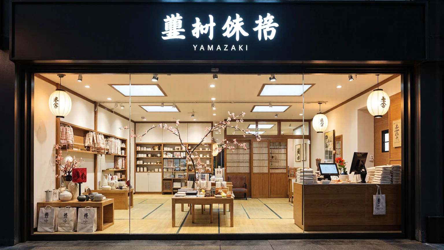 A minimalist Japanese retail store at sunset with a matte black exterior and large glass window. Inside, there's a polished wooden checkout counter, warm lighting from paper lanterns, shelves of merchandise, and a low table displaying seasonal items like tea sets.