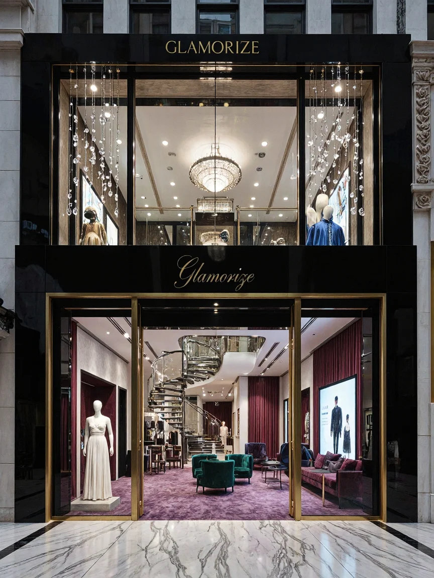 Ultra-glamorous retail store design with glossy black exterior, glass façade featuring 'Glamorize' in gold, grand chandelier, marble and plush carpet flooring, sleek glass partitions, themed sections, spiral staircase, cozy sitting area, digital screens, VIP shopping area.