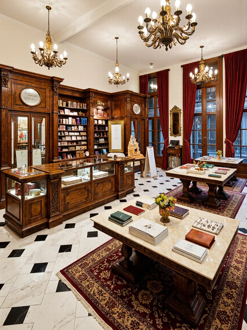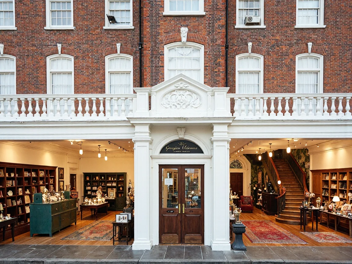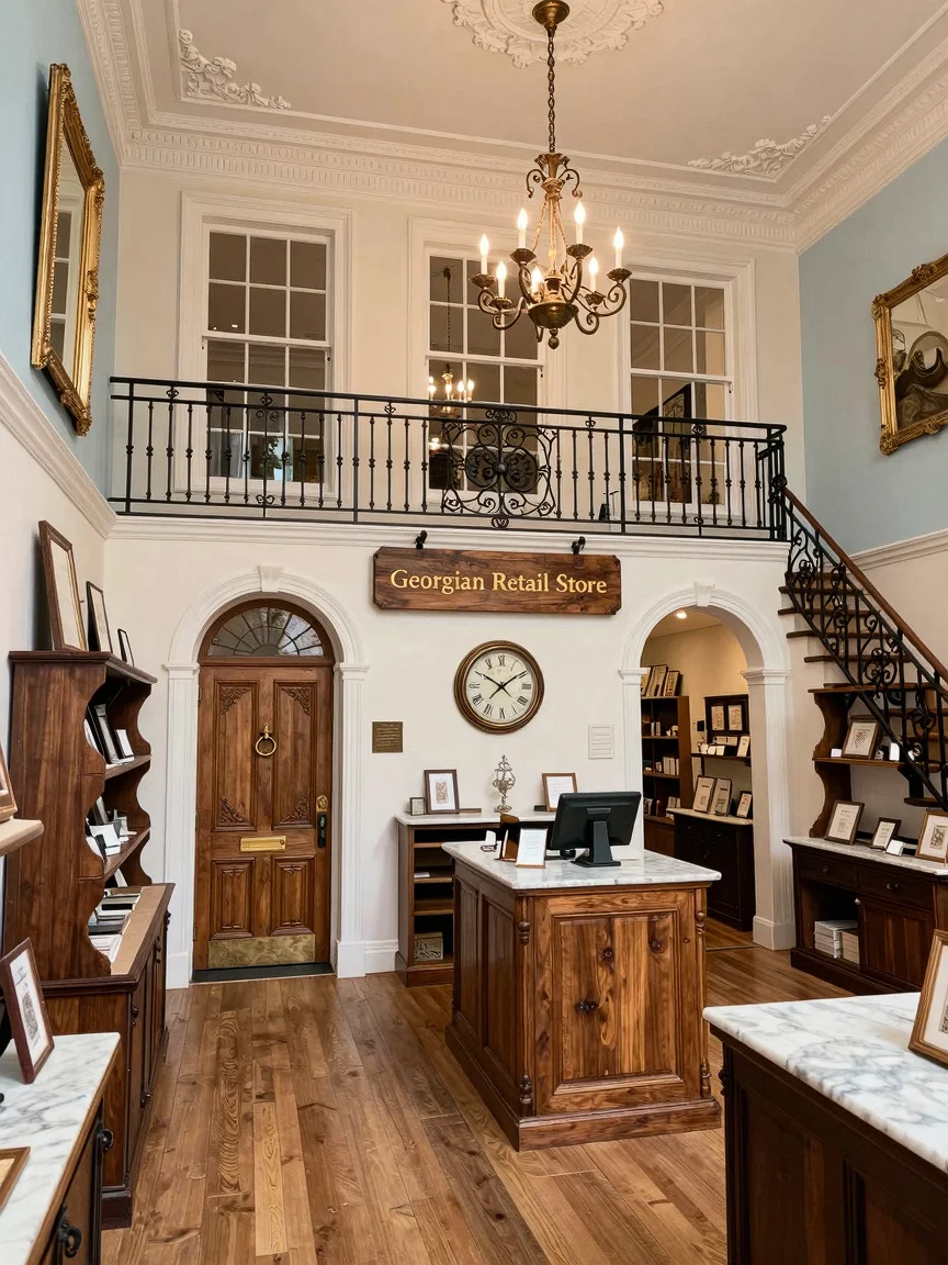 A Georgian retail store with a symmetrical facade, white stucco moldings, tall rectangular windows with black wrought iron railings, a grand oak front door with intricate carvings, and an inviting interior featuring arched doorways, chandeliers, and dark mahogany shelving units.