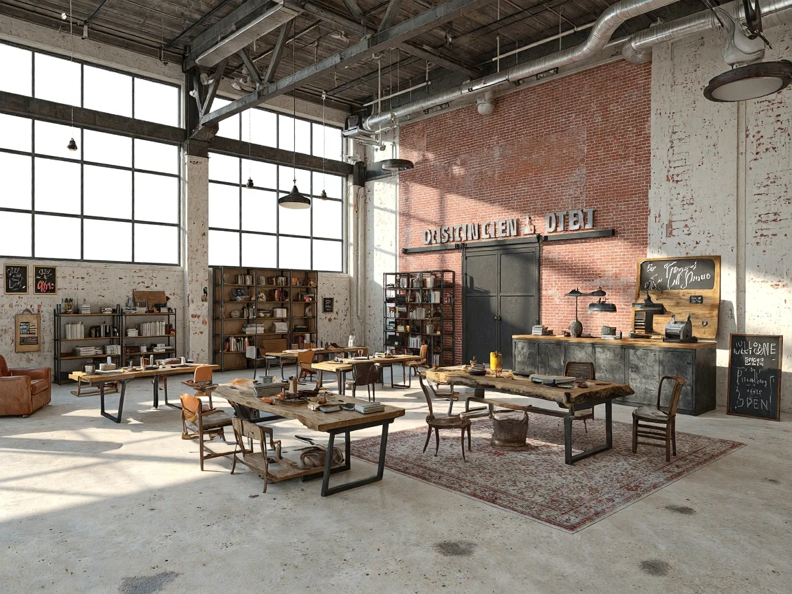 Design a spacious industrial-style retail store with large glass windows, a vintage red brick mural, worn polished concrete floors, steel beams, and exposed pipes. Include reclaimed wood tables, custom-built shelving, a cozy seating area, and a checkout counter made from live-edge wood.