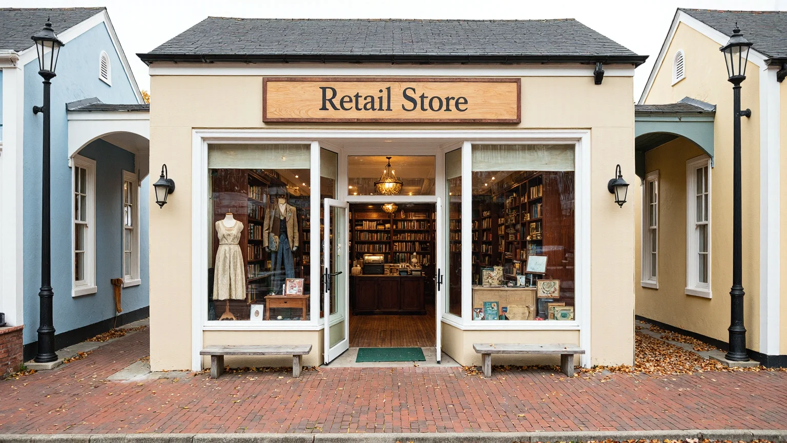A two-story retail store design inspired by colonial architecture, featuring a rustic red-brick exterior, large display windows, hardwood flooring, and an antique cashier's counter. Inside, wrought iron clothing racks, oak shelves, and hanging lantern-style lights create a cozy atmosphere.