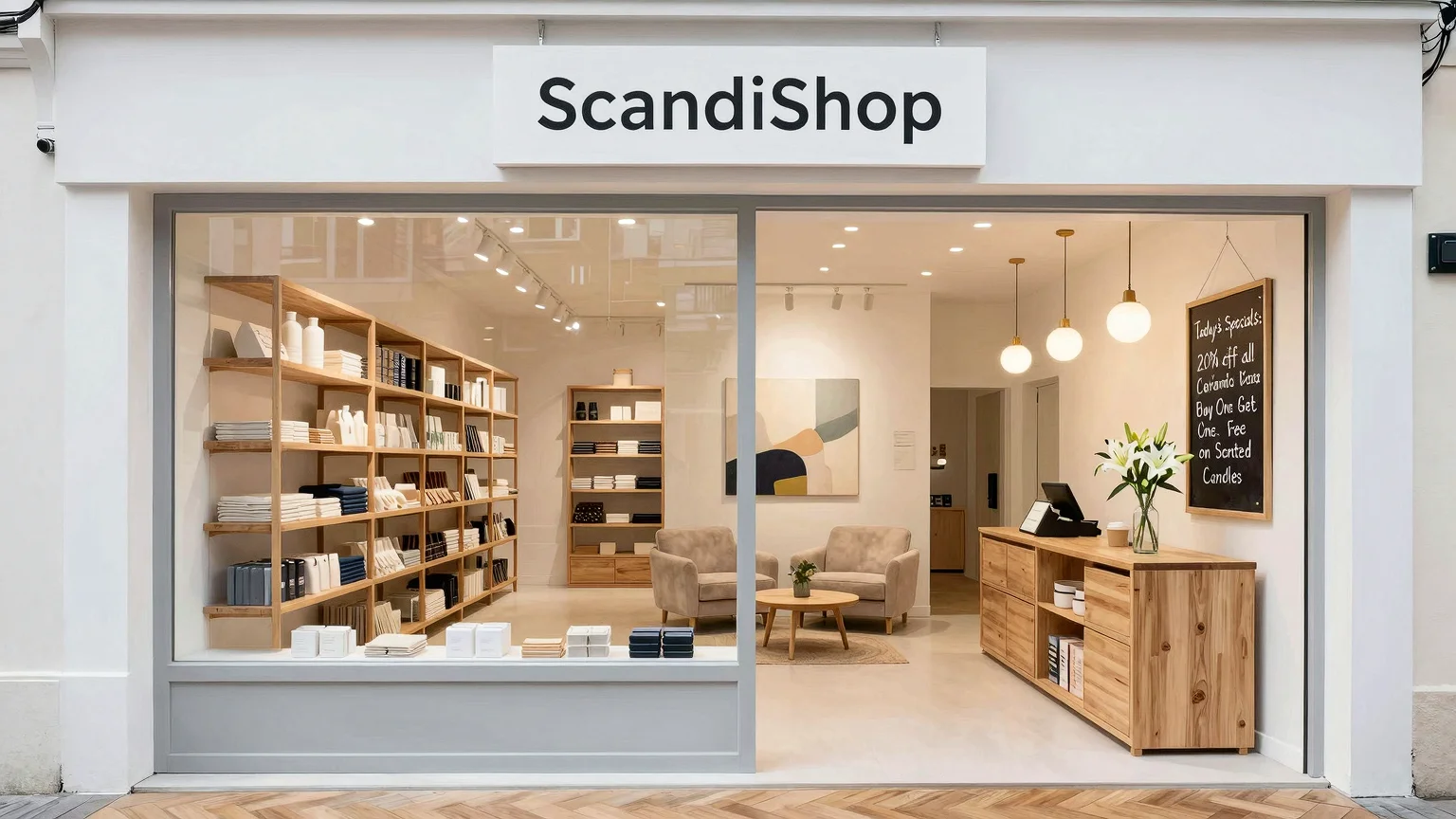 A medium-sized Scandinavian retail store with a white color theme, large glass window with a pastel gray frame, light oak wood shelving units, a birch wood counter, natural hardwood herringbone flooring, spherical pendant lights, and a cozy seating area with suede armchairs.
