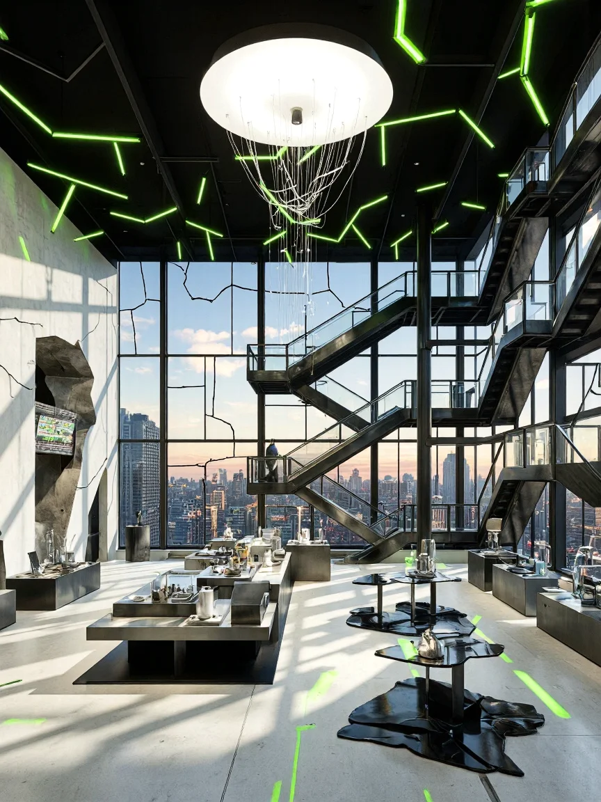 A Deconstructivist retail store with angular geometries, leaning walls, undulating floors, and jagged ceilings. Features reflective stainless steel display units, crisscrossing escalators, a fragmented central counter, and floor-to-ceiling windows with cityscape views at sunset. LED lights in zigzag patterns enhance the complexity.