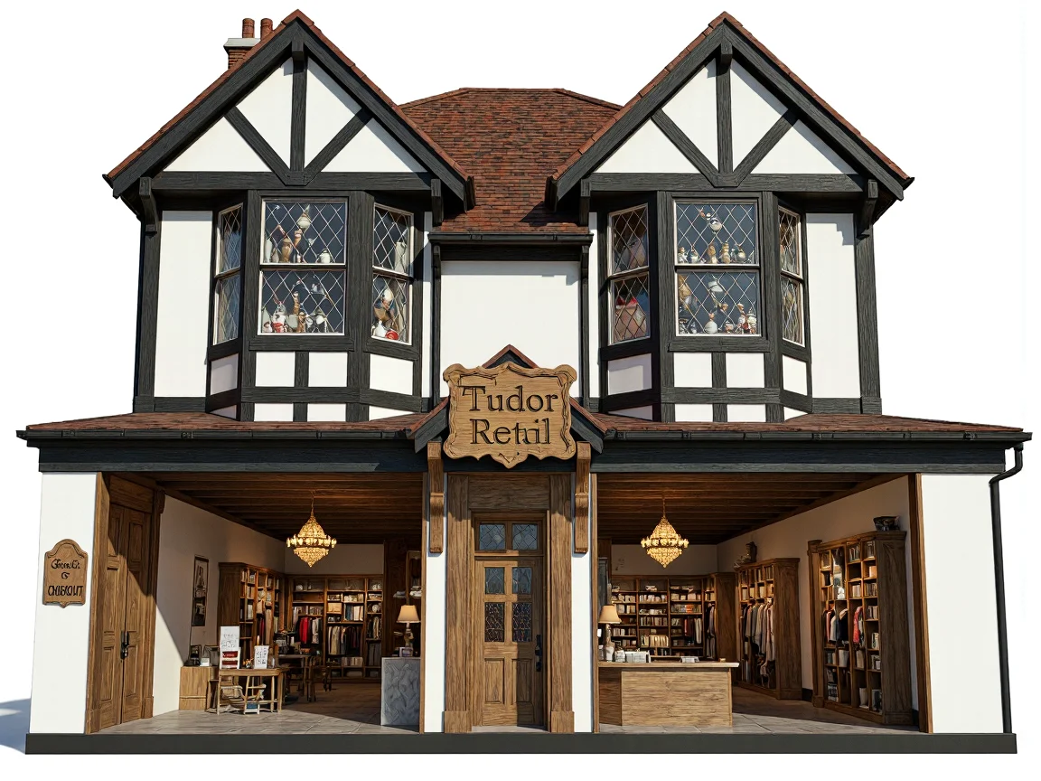 Tudor-style retail store design, 50ft long, 30ft wide, white plaster walls, dark timber frames, steeply sloping roof with red clay tiles, bay windows with leaded glass, wooden entrance door with black metal studs, 'Tudor Retail' sign, exposed wooden beams, rustic stone tile flooring, wooden shelves with vintage clothing and decor, freestanding display tables, grand chandelier, oak wood checkout counter with 'Checkout' sign.