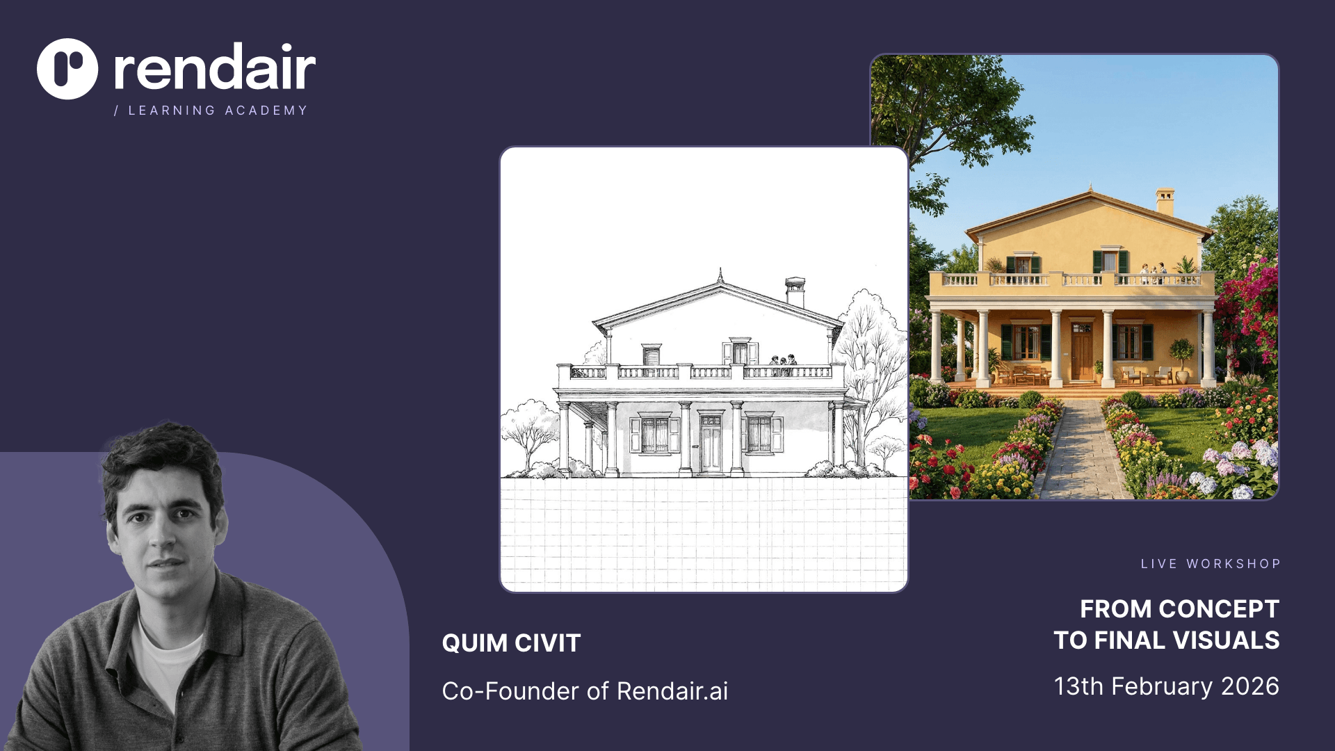 During the session, you will discover how to integrate AI into your everyday workflow to work faster, communicate design intent more clearly, and stay confident while using the latest technologies. Everything is demonstrated and practiced inside Rendair, so what you learn can be applied immediately to your own projects.