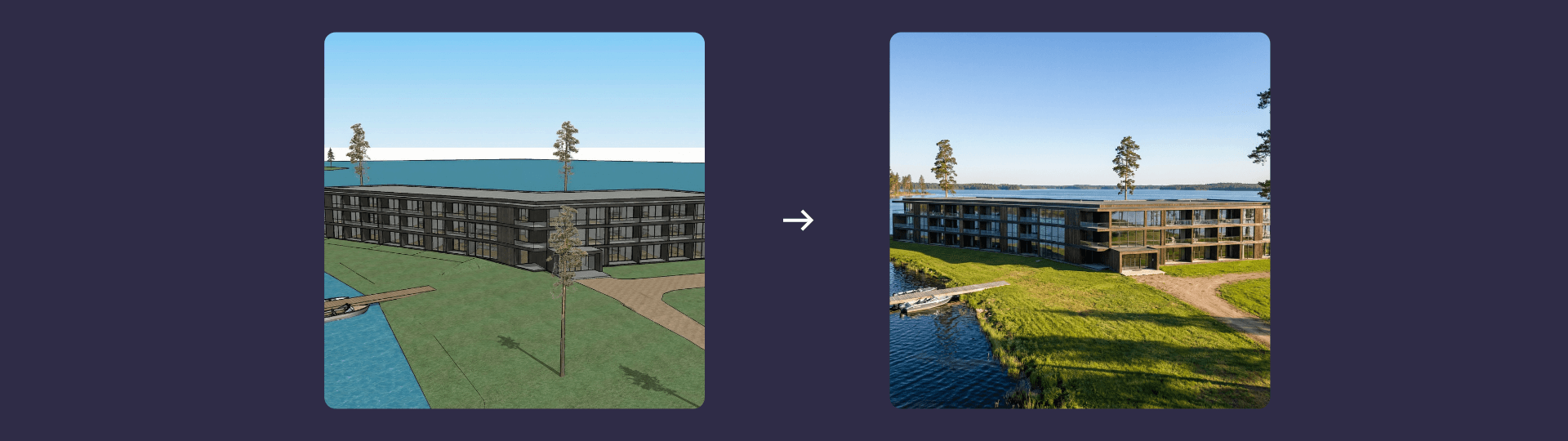 We bring a basic drawing or massing model into Rendair and transform it into a clear architectural render.